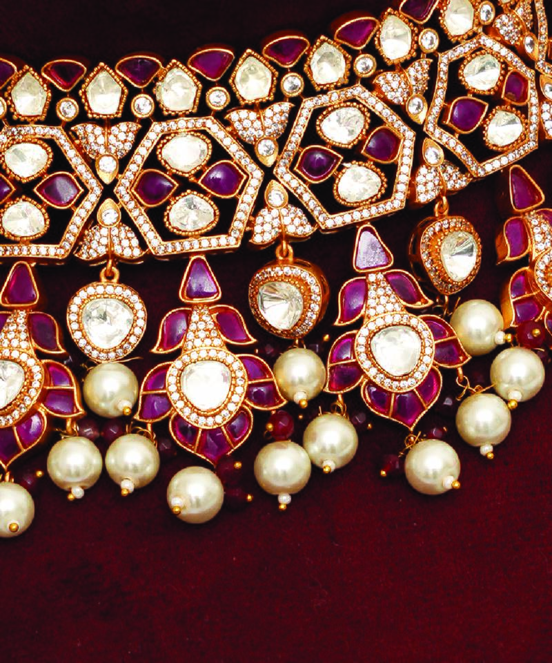 | Product Description | This Gold Plated Kundan Choker Set With Red Stones Offers A Bold And Elegant Statement. The Intricate Craftsmanship And Vibrant Tones Make It Perfect For Festive Occasions. Designed To Sit Gracefully On The Neckline, It Enhances Traditional Outfits With A Rich And Timeless Appeal.