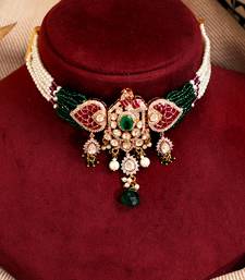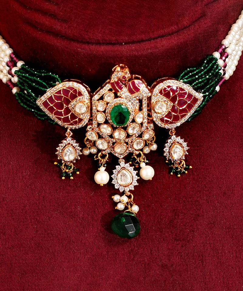 | Product Description | Make A Statement With This Designer Jadau Choker Set, Featuring A Stunning Peacock Inspired Design Embellished With Sparkling Mossanite Stones And Delicate Semi Precious Pearls. Crafted With Precision, This Choker Combines Heritage Artistry With Modern Elegance, Making It Perfect For Weddings, Festive Celebrations, And Special Occasions.