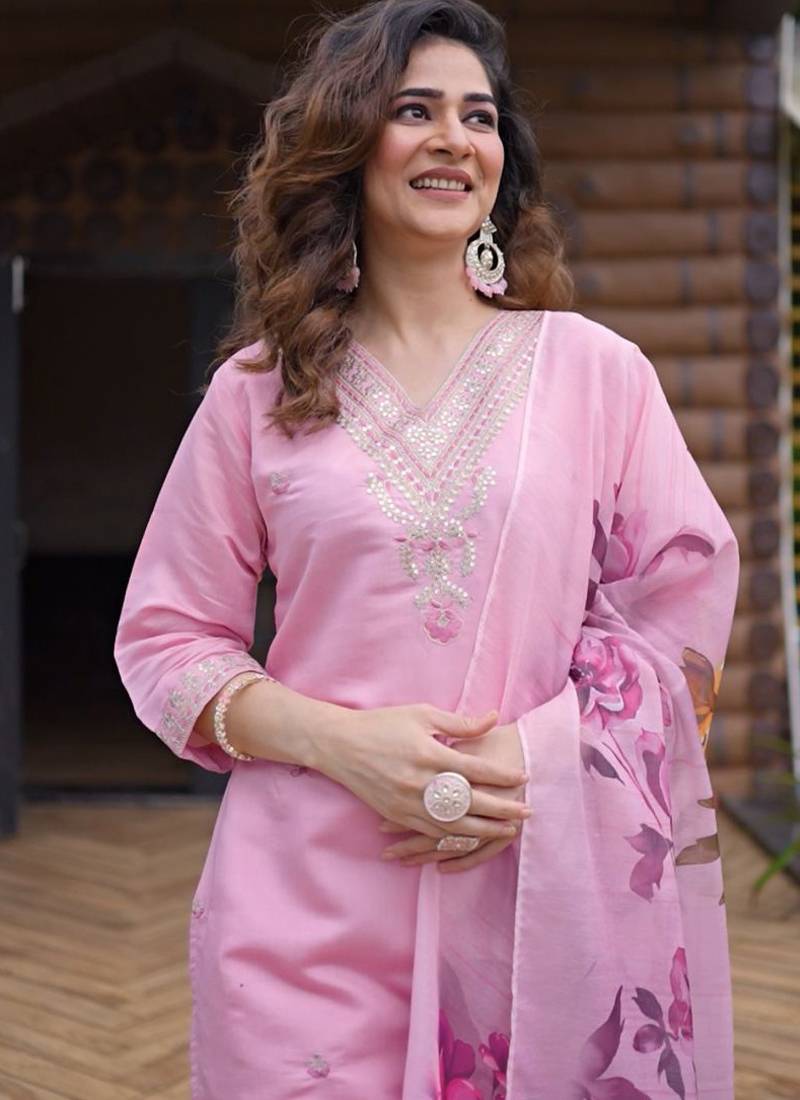 | Product Name | Light Pink Roman Silk Kurti Pent Dupatta Set | |
