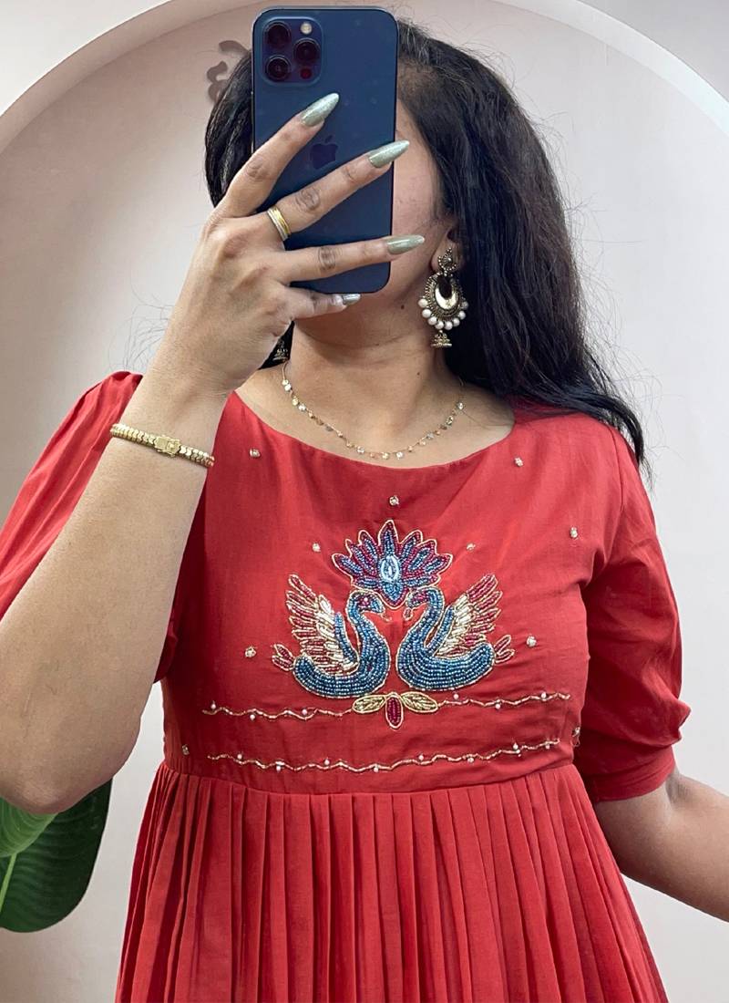 Orange pure mul cotton handwork kurti with designer sleeves stitched
