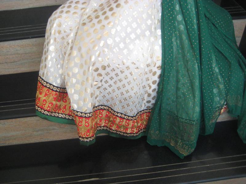 | Product Description | Red Raw Silk Yoke With Embroidery In The Collar & Classic Off White & Gold Chanderi Ghera. The Ghera Has Red, Black & Green Border Work Of Gold & Sequins. This Is A Full Suit Accopanied By A Red Lycra Net Stretchable Churidaar & A Green Gold Dotted Dupatta. |