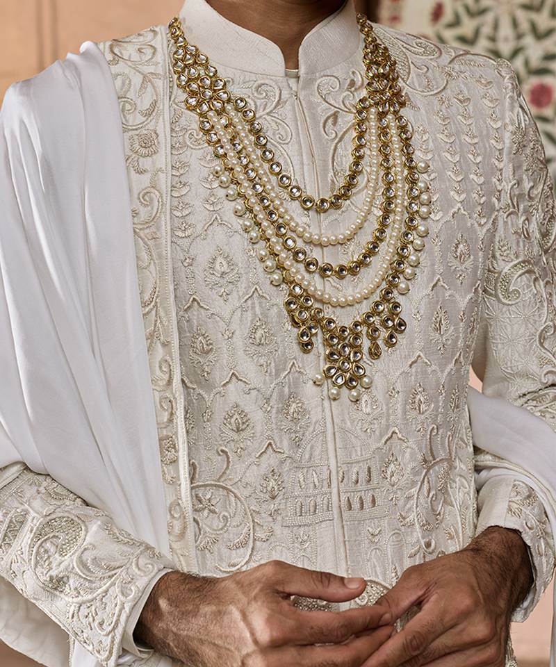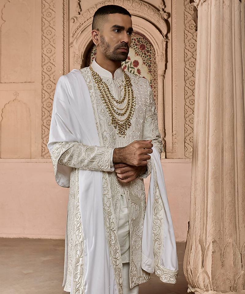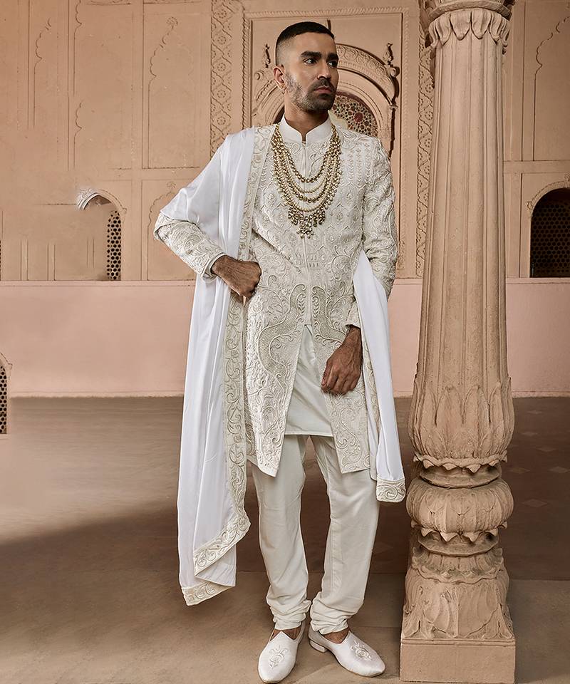 | Product Description | An Ivory Raw Silk Sherwani Embellished With Refined Embroidery, Offering A Graceful Balance Of Subtle Luxury And Traditional Charm. The Textured Weave And Tailored Silhouette Provide A Polished Appearance, Suitable For Weddings And Cultural Festivities With Understated Sophistication.