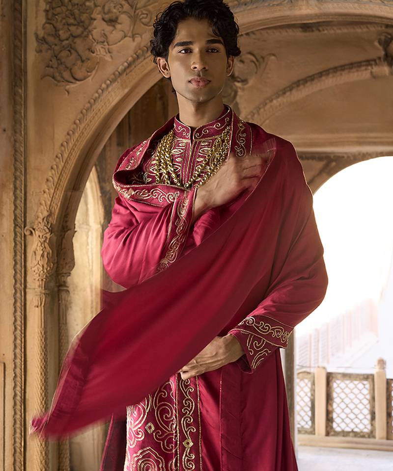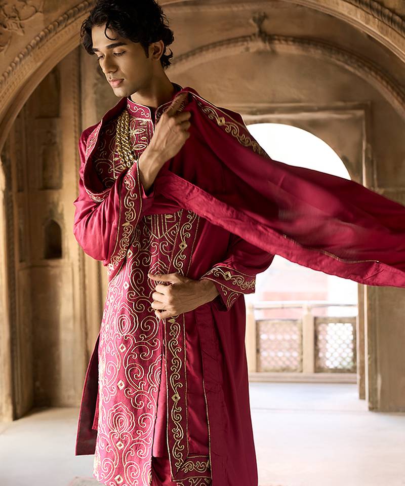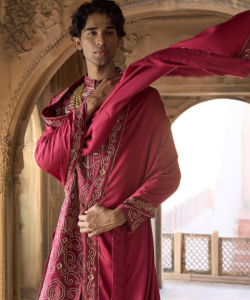 | Product Description | A Regal Maroon Sherwani Crafted In Luxurious Raw Silk, Highlighted With Intricate Embroidery For A Refined Ceremonial Appeal. The Rich Hue And Textured Finish Lend Depth And Grandeur, Making It An Ideal Choice For Weddings And Festive Occasions With A Timeless, Royal Presence.