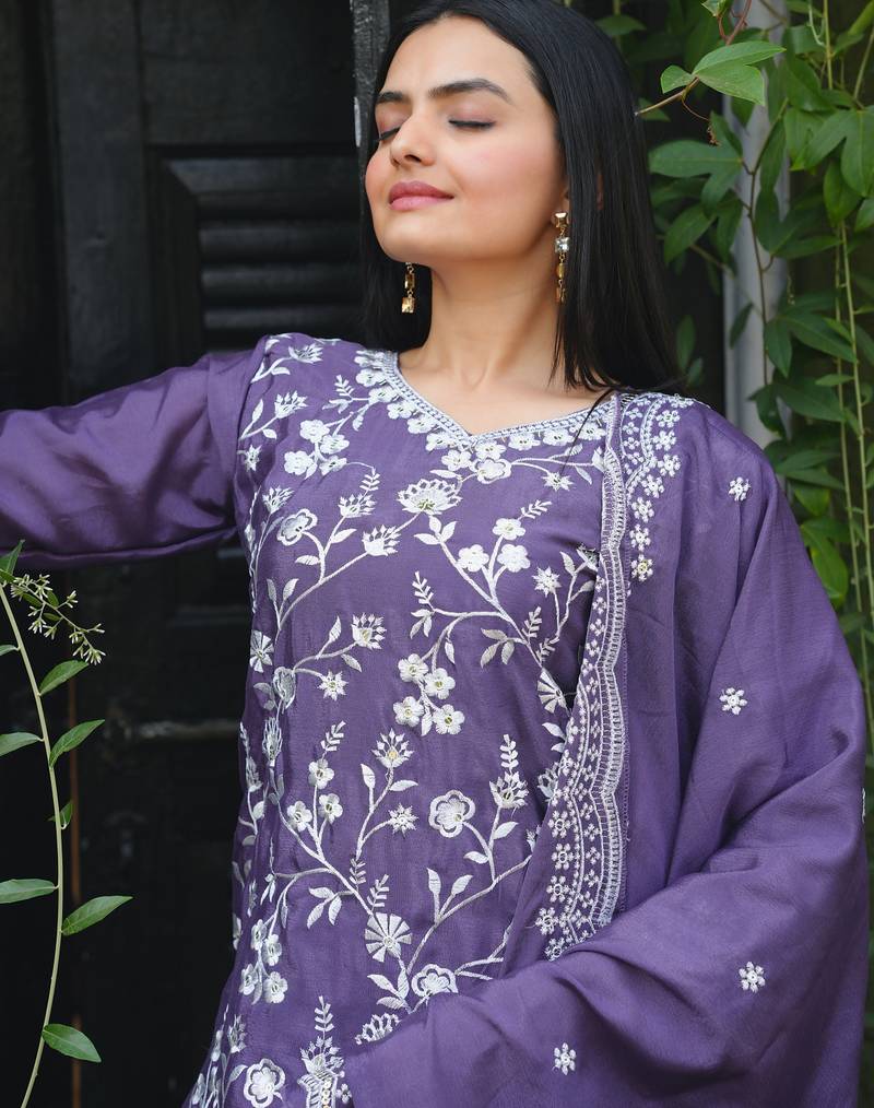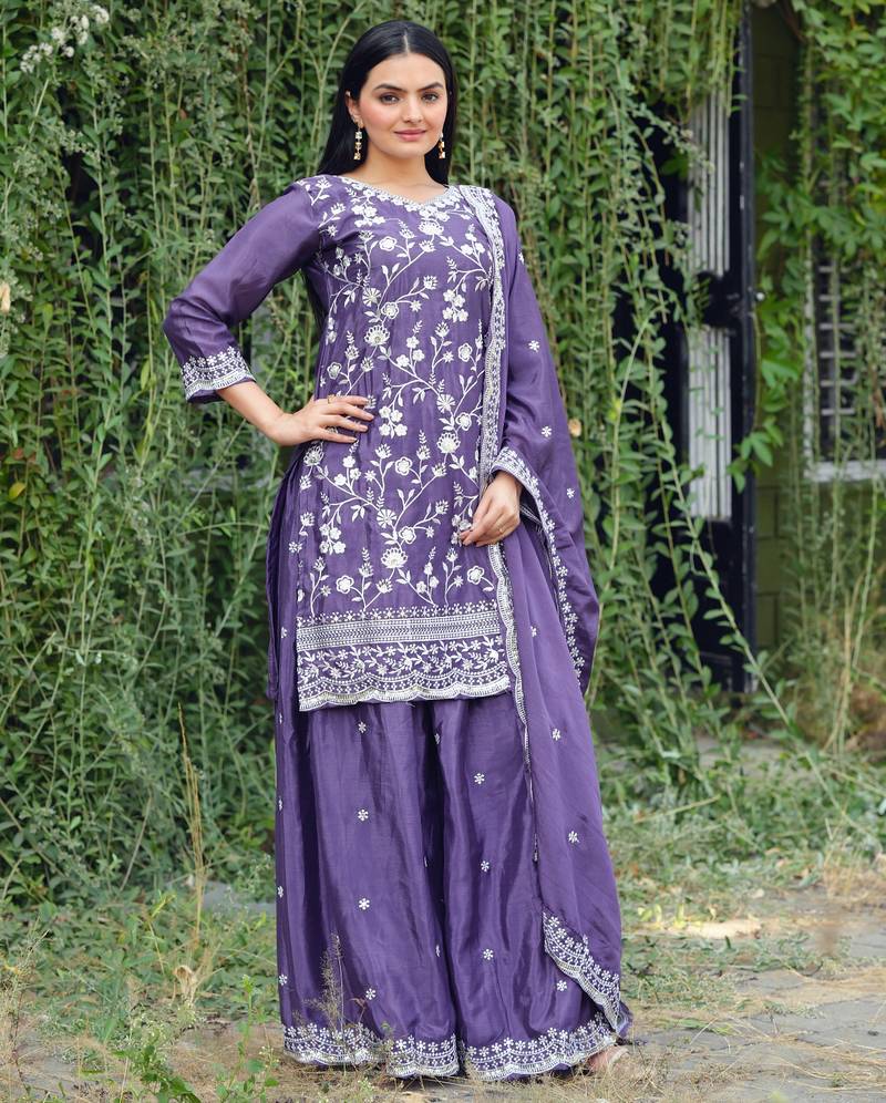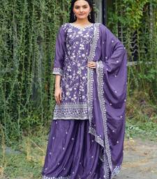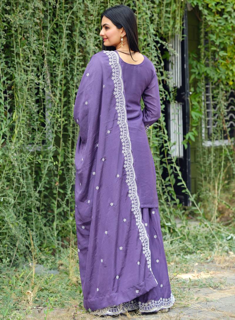 Lavender festive wear designer chinon sequence embroidery work readymade suit stitched