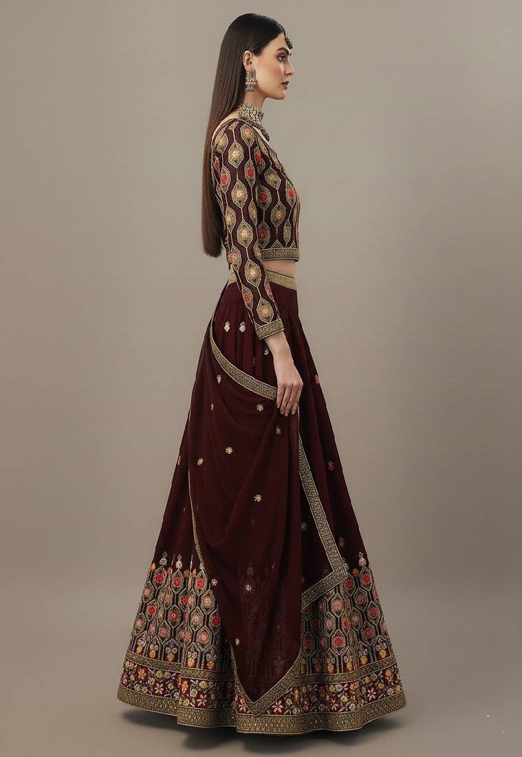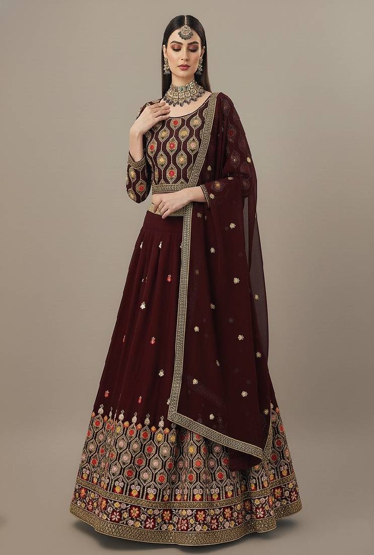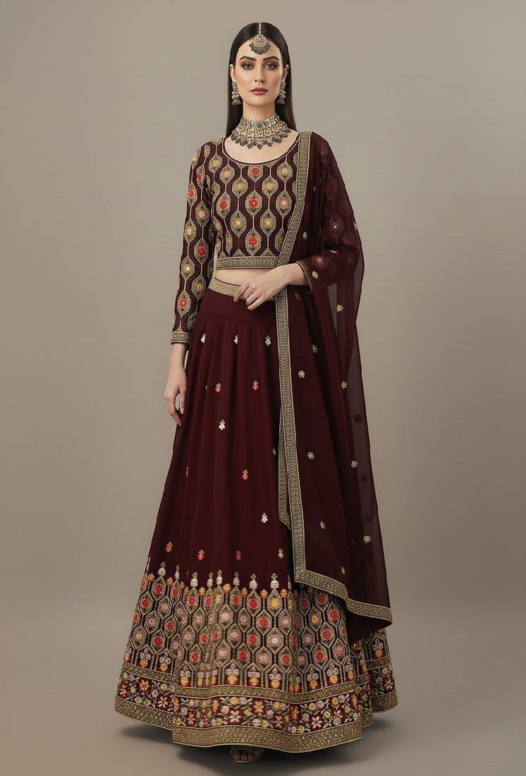 Maroon multi needle , sequence 5mm , coding , embroidery , zari faux georgette lehenga choli with dupatta