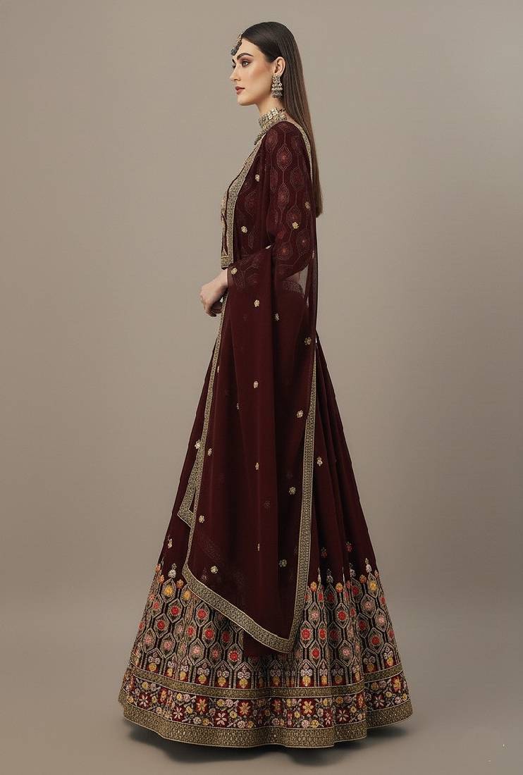 | Product Name | Maroon Multi Needle , Sequence 5mm , Coding , Embroidery , Zari Faux Georgette Lehenga Choli With Dupatta | |