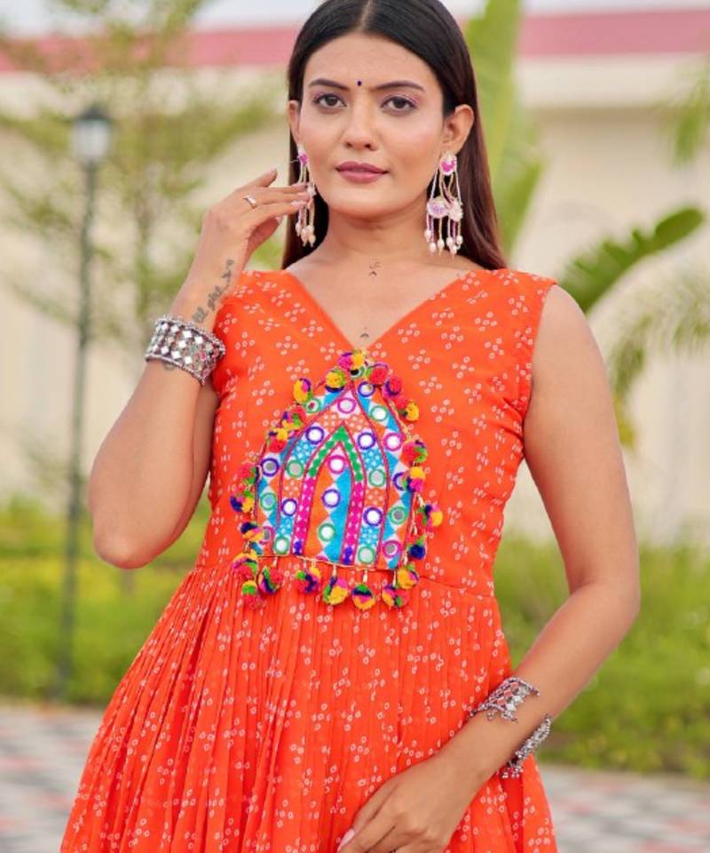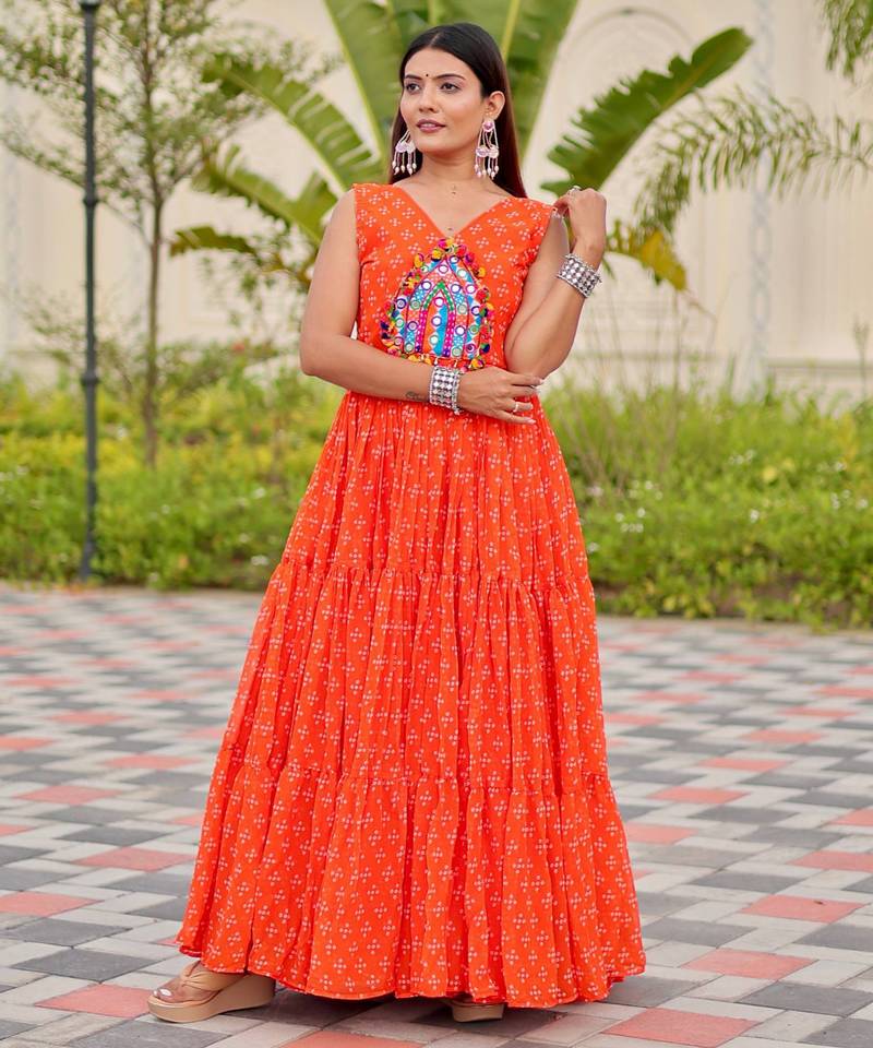Orange festive wear designer faux georgette embroidery thread work with real mirror work readymade suit stitched