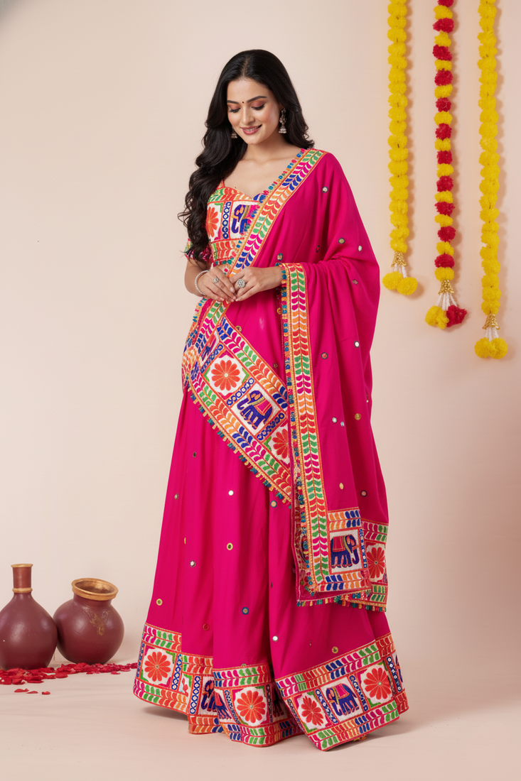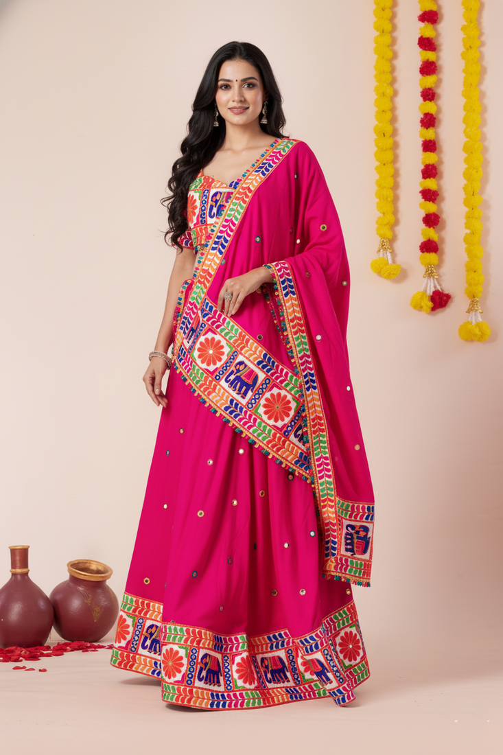 | Product Description | Exclusive Designer Navratri Wear Lehenga Choli, Perfect For Garba Nights And Festive Celebrations. Rich Gota Work With Mirror And Embroidery Detailing Adds Traditional Elegance And Vibrant Shine. Lehenga Crafted With A 42 Inch Length And 3.5 Meter Flare, Offering A Graceful, Twirl Worthy Silhouette. Comes With A 1 Meter Unstitched Choli, Allowing Customized Stitching For The Perfect Fit. Paired With A 2.30 Meter Dupatta To Complete The Festive Look With Style And Charm. |