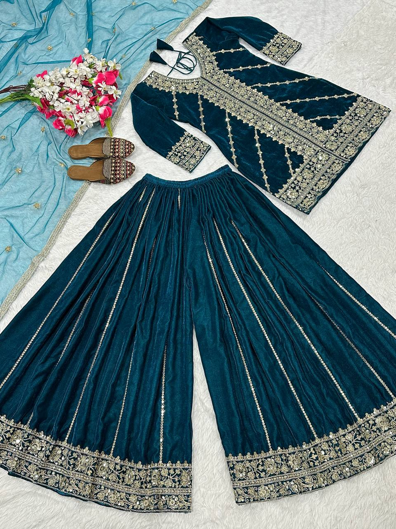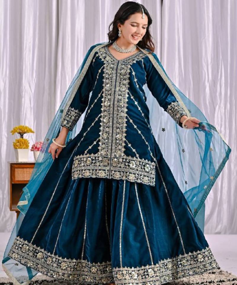 | Product Name | Teal Festive Wear Designer Pure Heavy Viscose Velvet Heavy Embroidery Sequence Work Readymade Suit | |