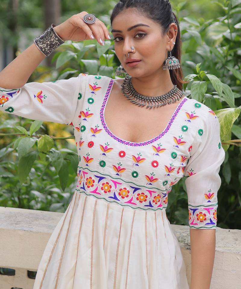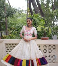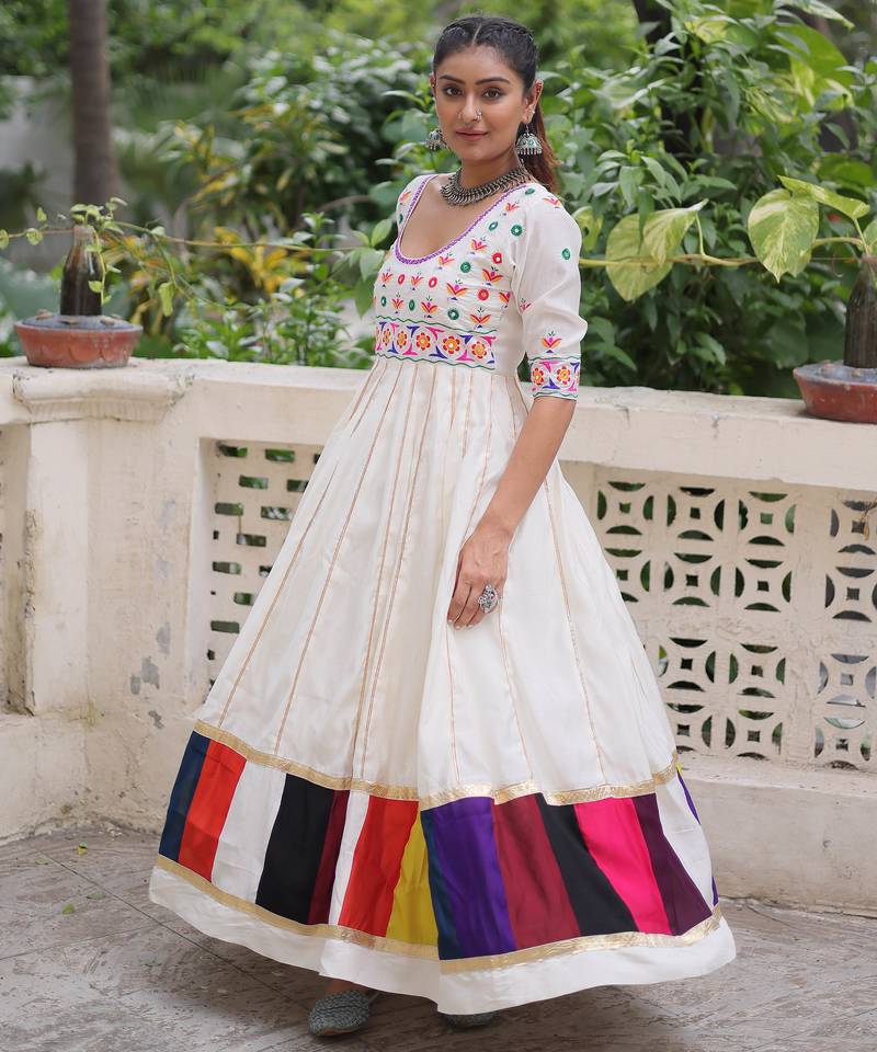 | Product Name | White Festive Wear Designer Roman Silk Thread Work & Gota Lace Embellished Work Readymade Suit | |