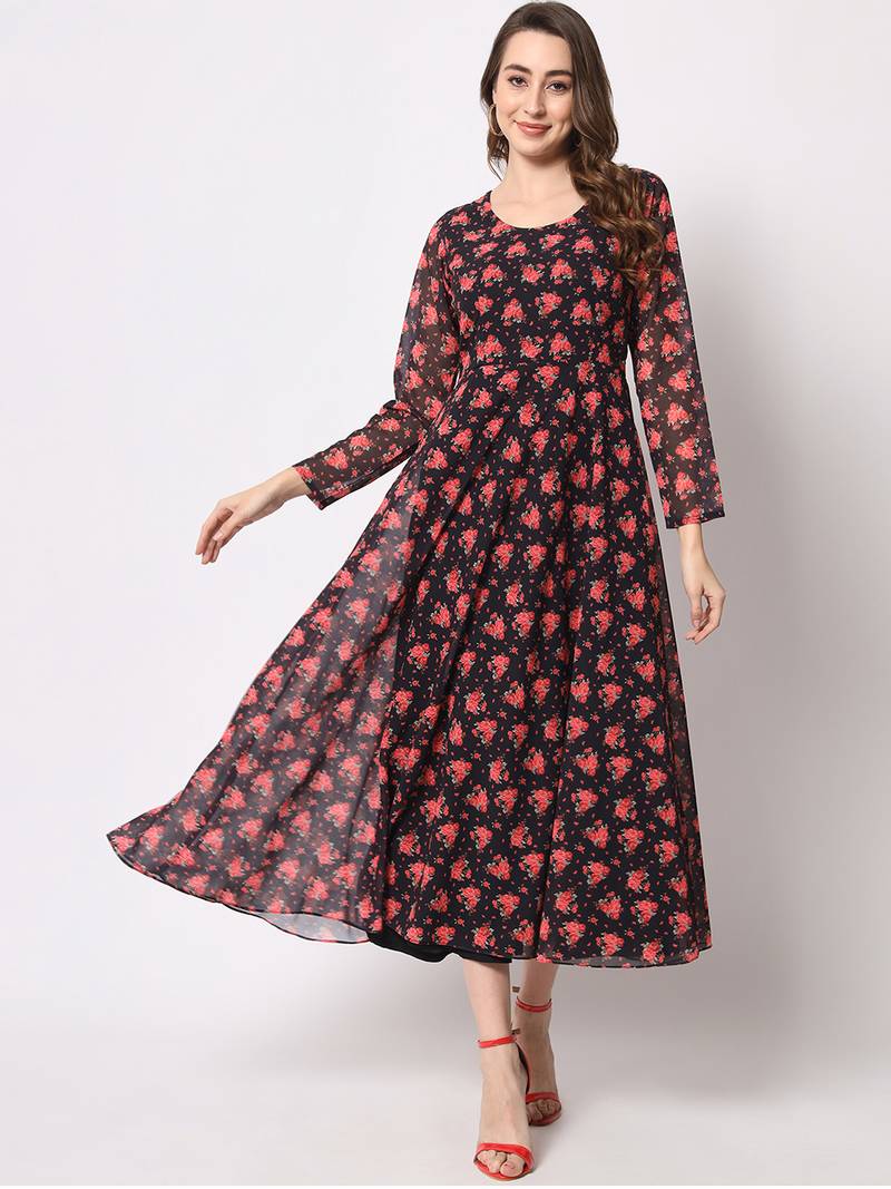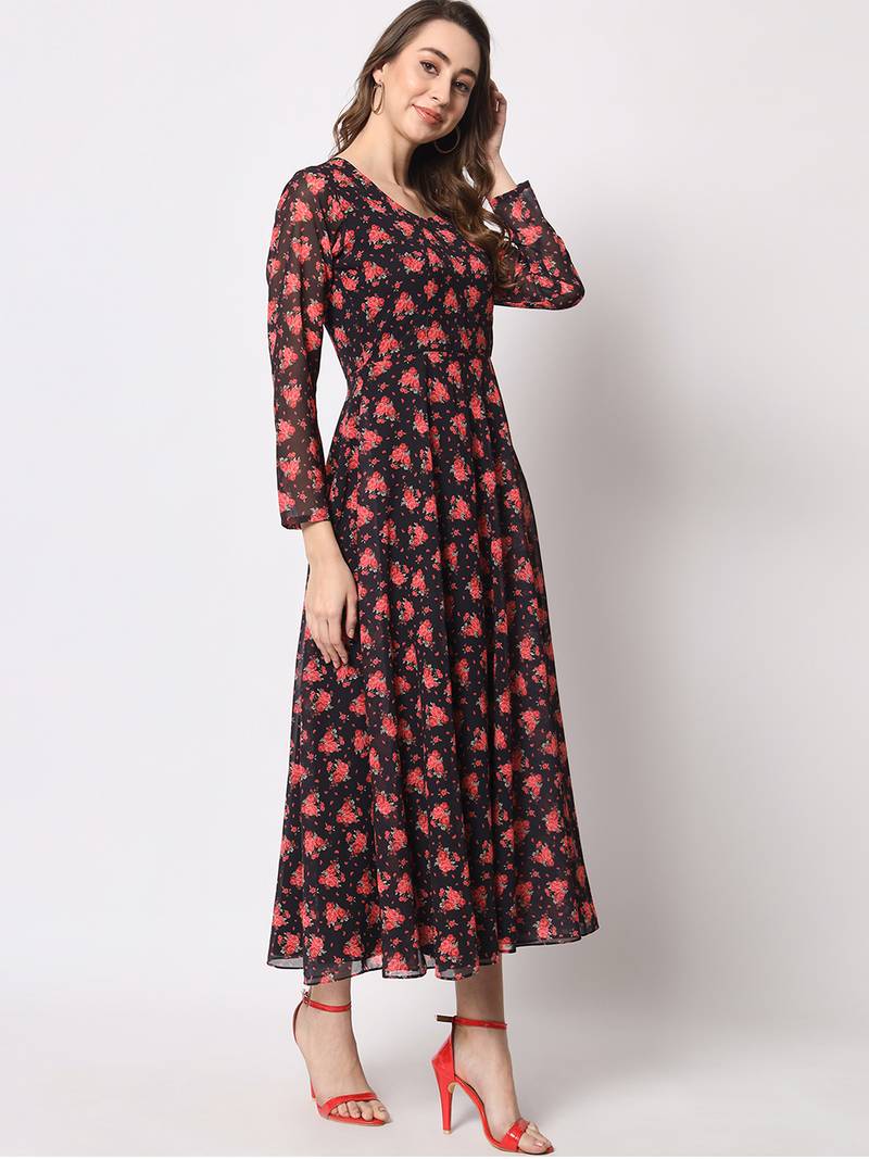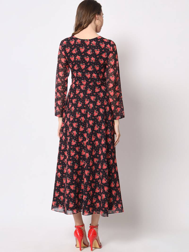 | Product Name | Black & Red Floral Printed Fit & Flared Maxi Dress | |