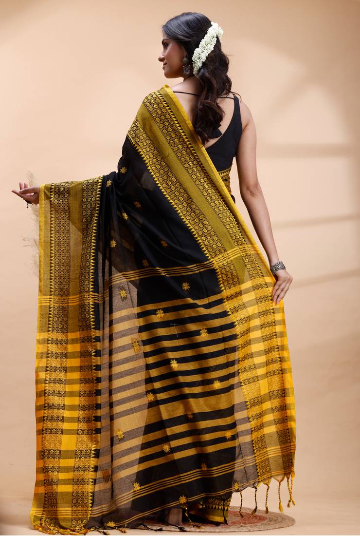 Black handloom saree with yellow traditional border & intricate weaving design