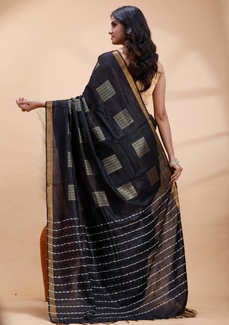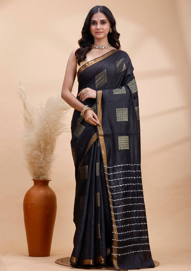 | Product Name | Black Soft Silk Saree With Gold Zari Motifs And Border | |