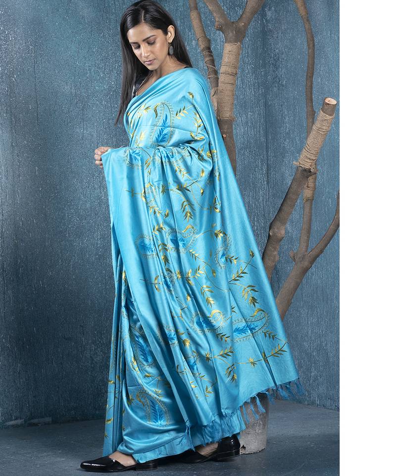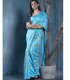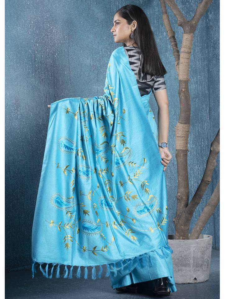 Blue blended linen saree with green color floral embroidery