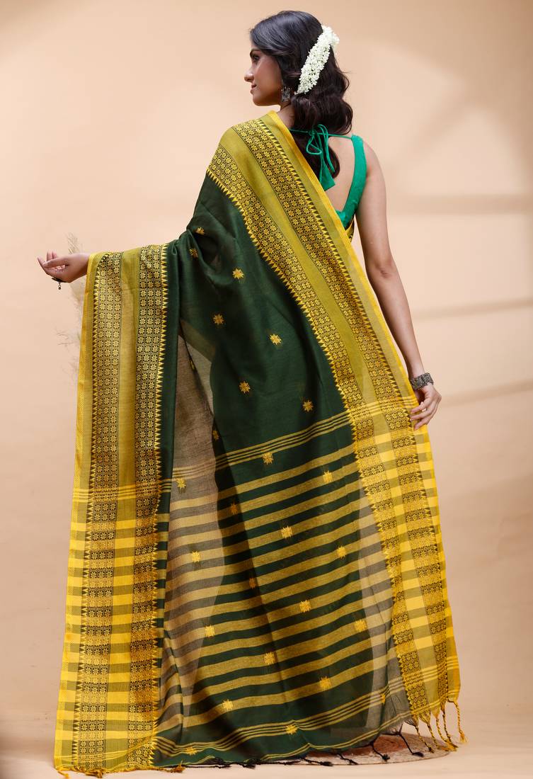 Dark green handloom cotton saree with yellow traditional border & intricate weaving design