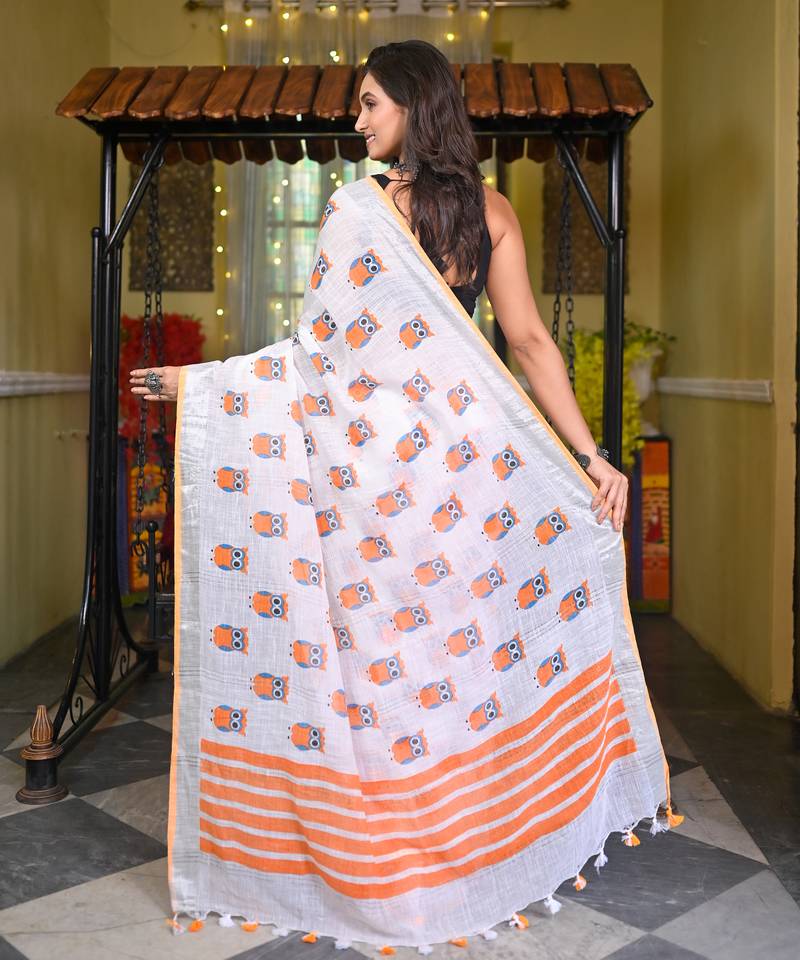 | Product Name | Offwhite Handloom Linen Saree With Orange Owl Block Prints All Over Body | |