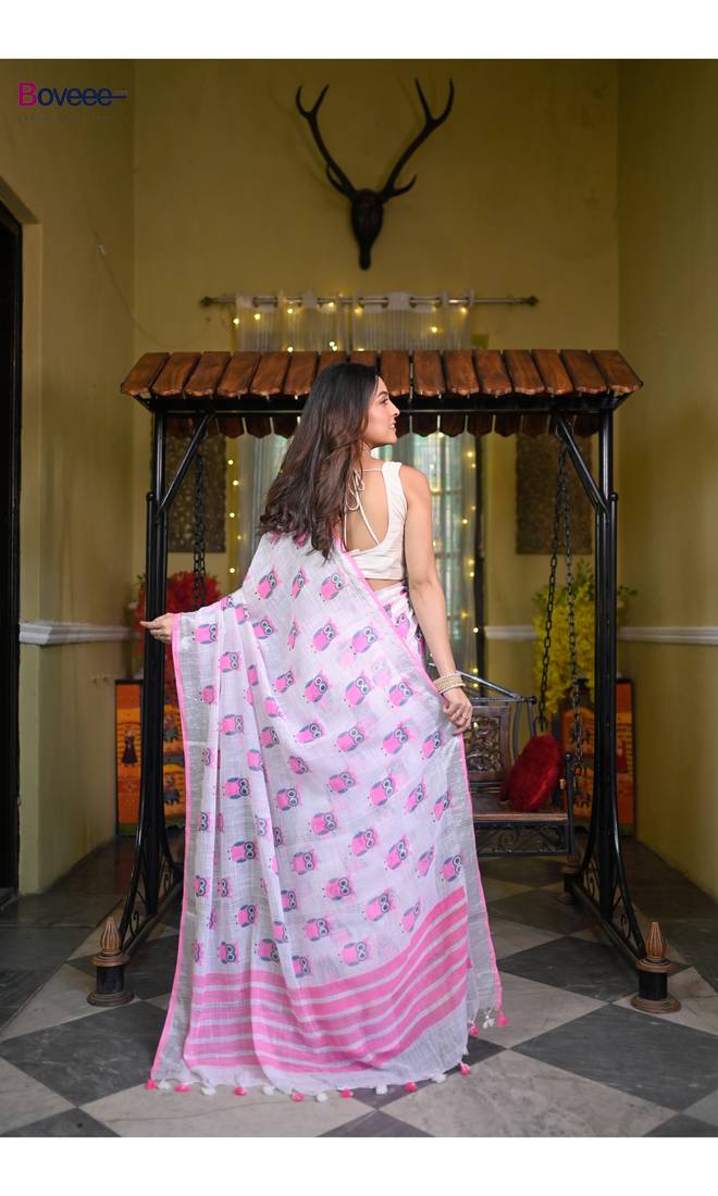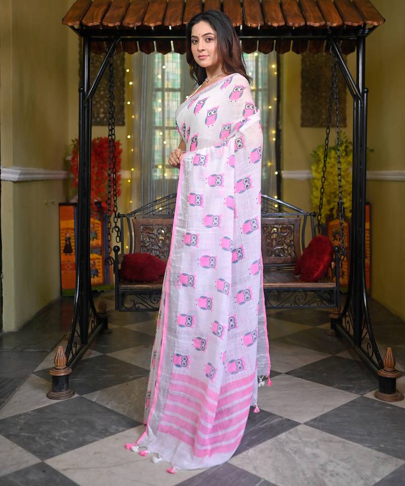 | Product Name | Offwhite Handloom Linen Saree With Pink Owl Block Prints All Over Body | |