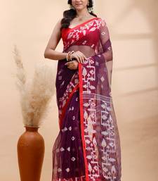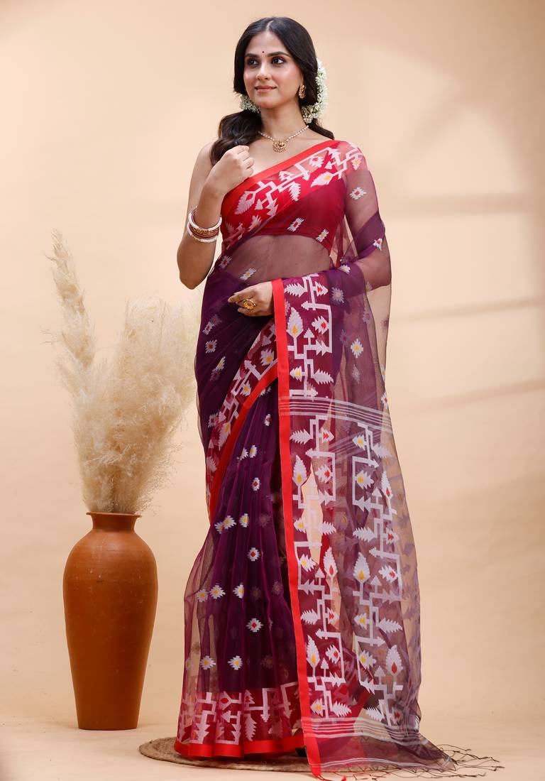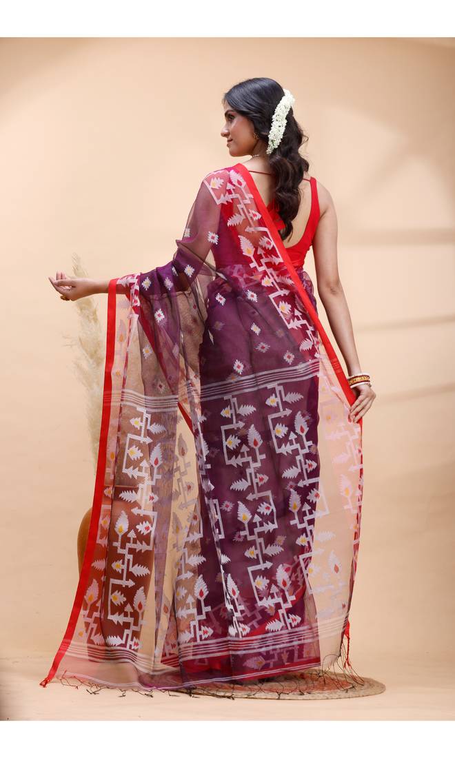 Purple & red muslin saree with delicate jamdani motifs and graceful contrast border