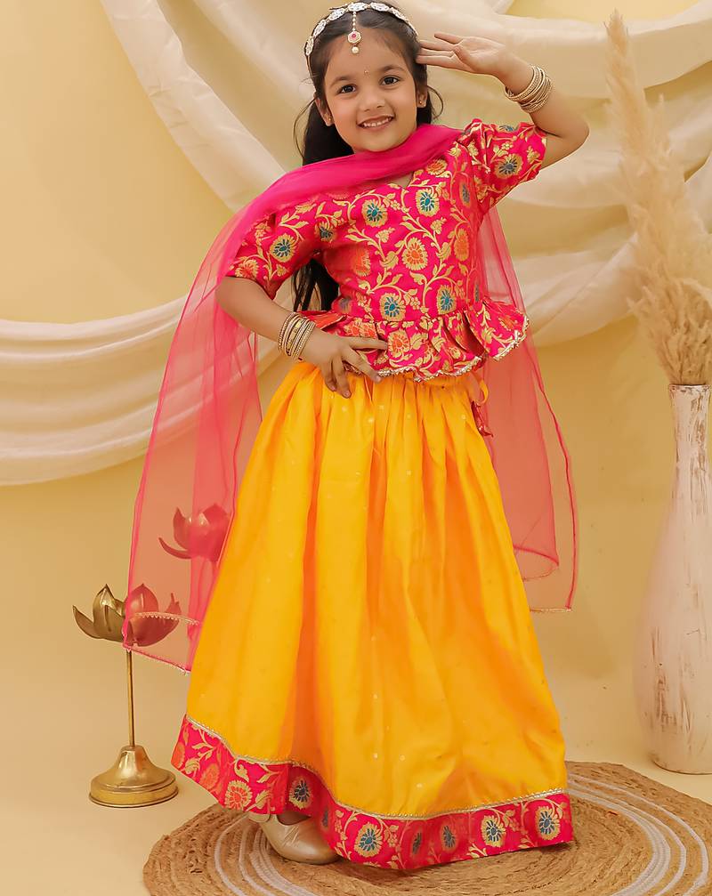 Short sleevesjacquard peplum lehenga choli with dupatta set for girls pink