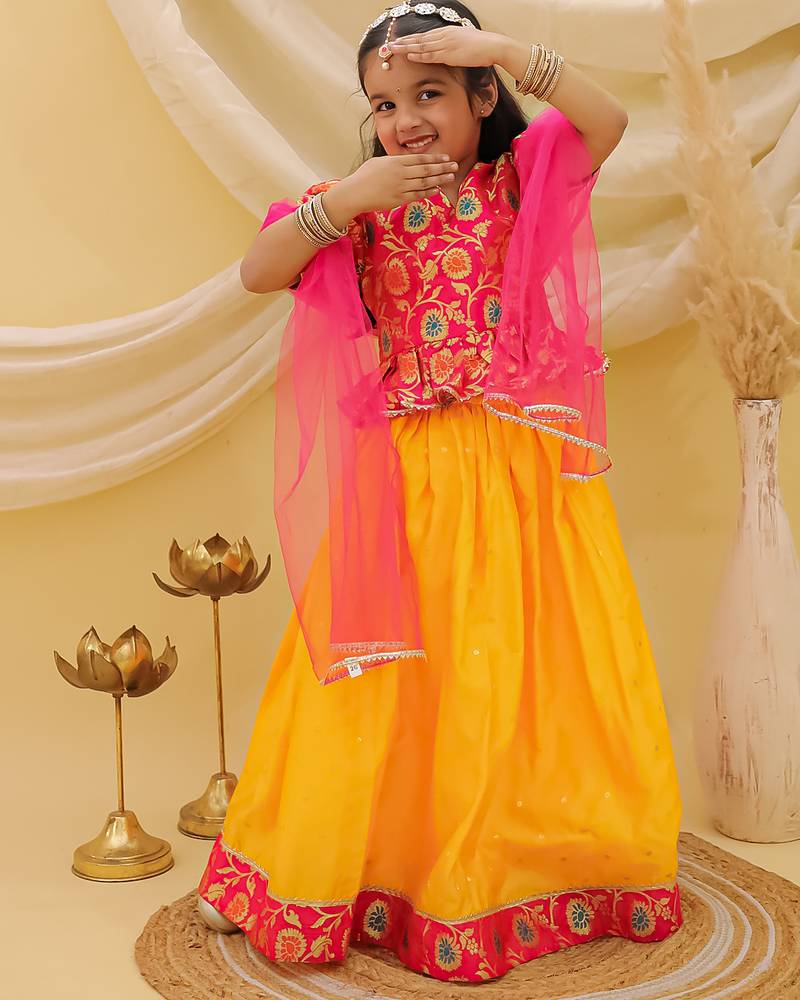 | Product Name | Short Sleevesjacquard Peplum Lehenga Choli With Dupatta Set For Girls Pink | |