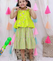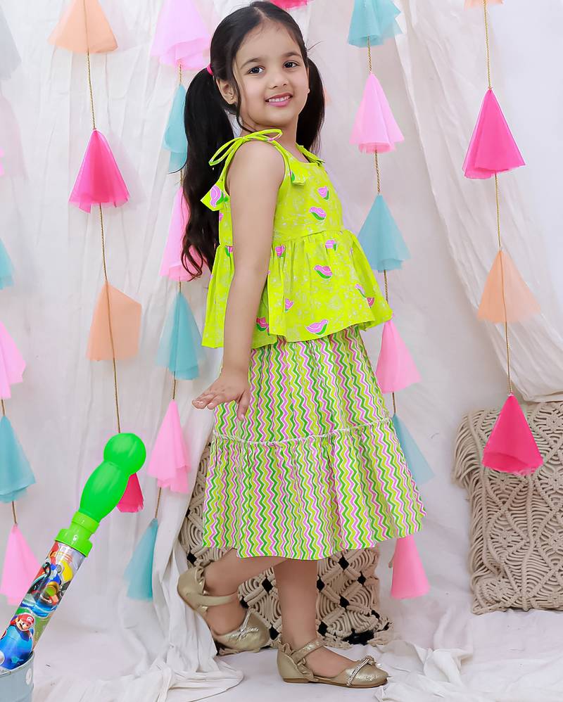 | Product Name | Summer Sleeveless Pure Cotton Printed Tieup Top & Skirt Set For Girls Green | |