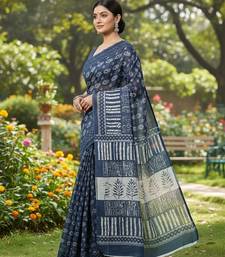 Blue fancy cotton handloom saree with blouse piece for women