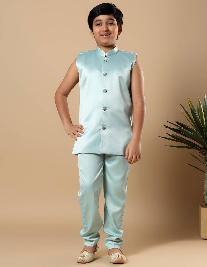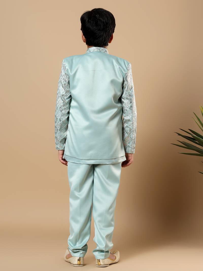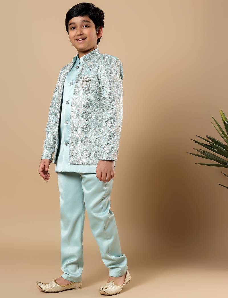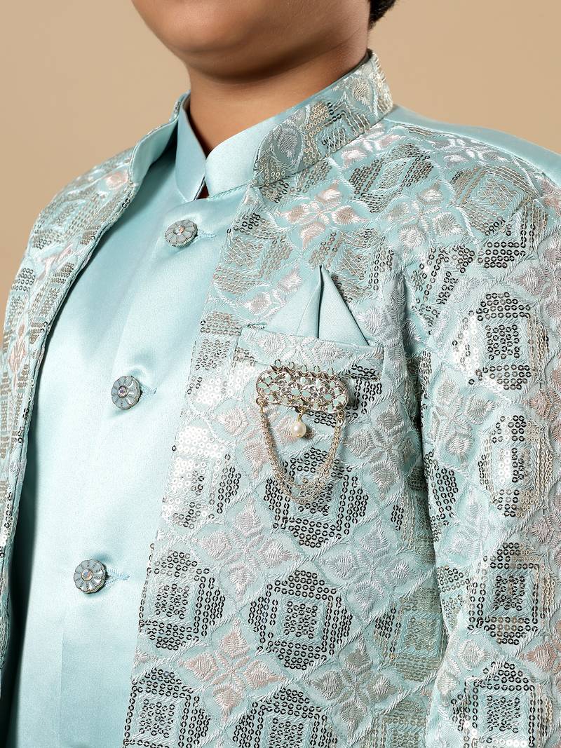 | Product Name | Boys Aqua Blue Satin Geometric Diamond Jaal Embroidered Sequined Sherwani & Trouser Set With Shrug | |