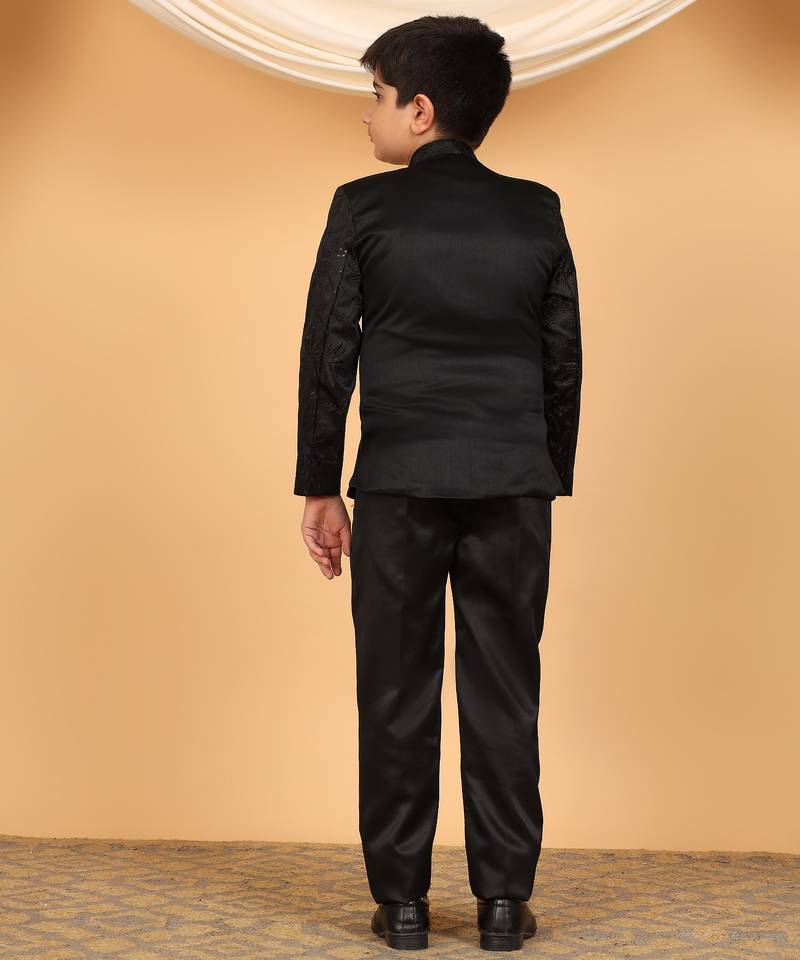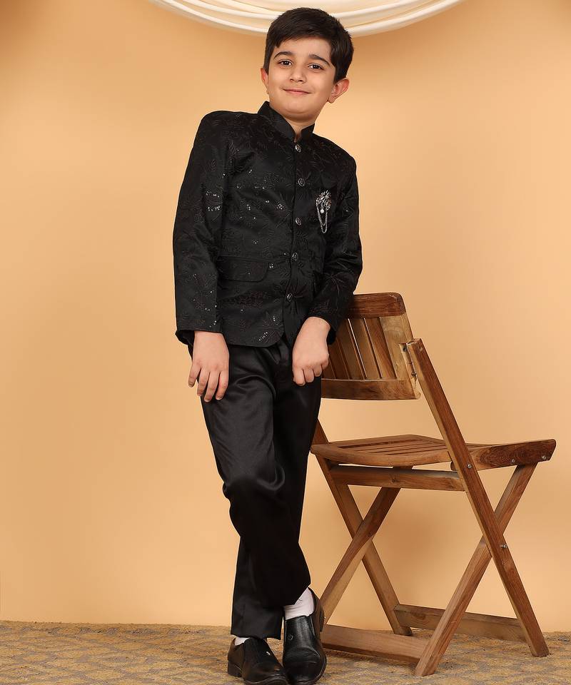 | Product Description | Make A Stylish Statement With This Bandhgala Suit Set. Tailored In Smooth Satin Fabric, The Bandhgala Blazer Features Intricate Embroidery With Delicate Sequins, Lending A Rich And Festive Appeal. Designed With A Structured Silhouette, The Blazer Creates A Classic Look While Maintaining Absolute Comfort. Paired With Solid Trousers For A Sleek Finish, This Ensemble Is Perfect For Weddings, Parties And Special Celebrations, Giving Your Young One A Sharp And Elegant Presence. |
