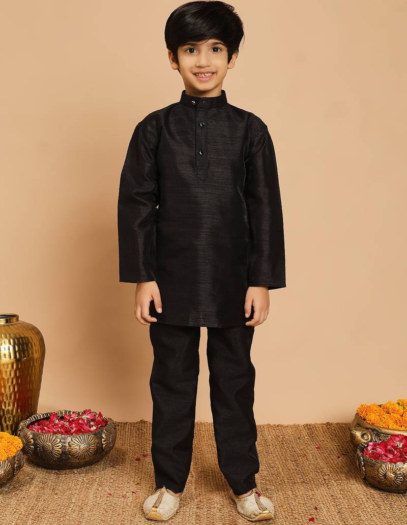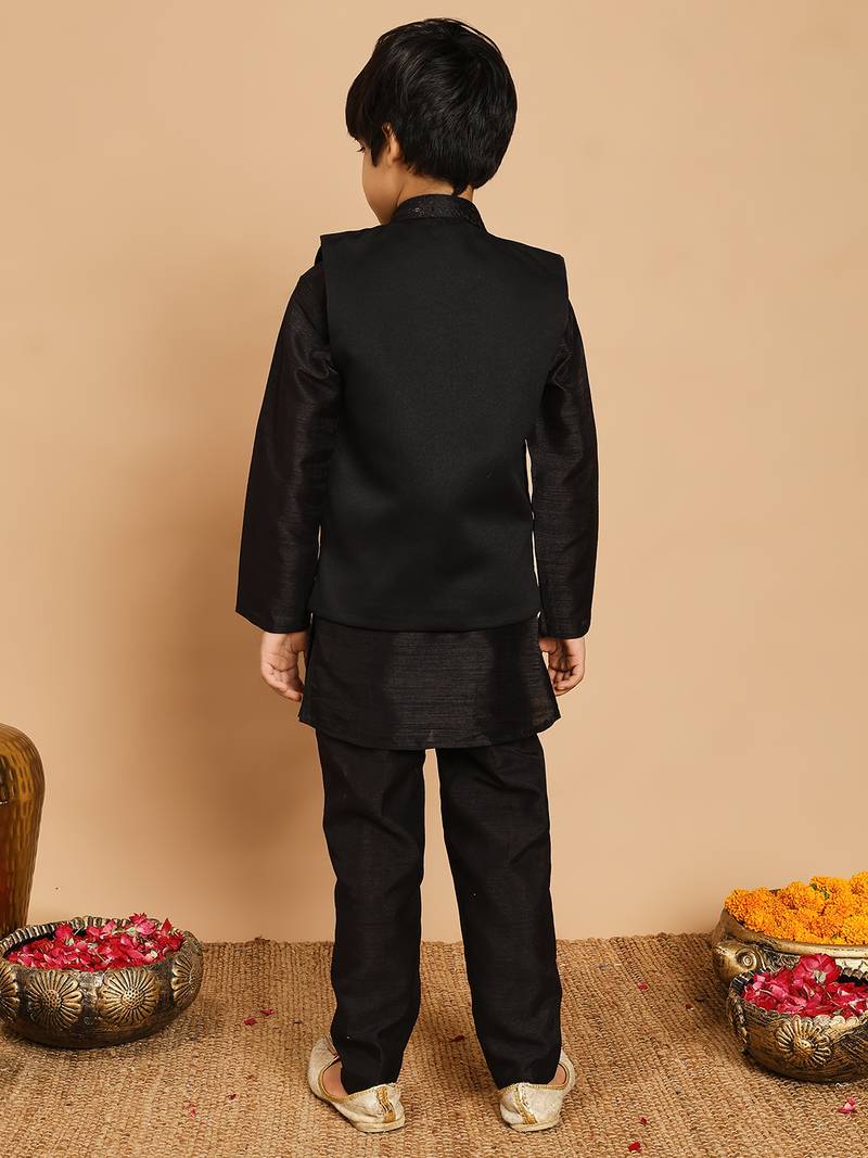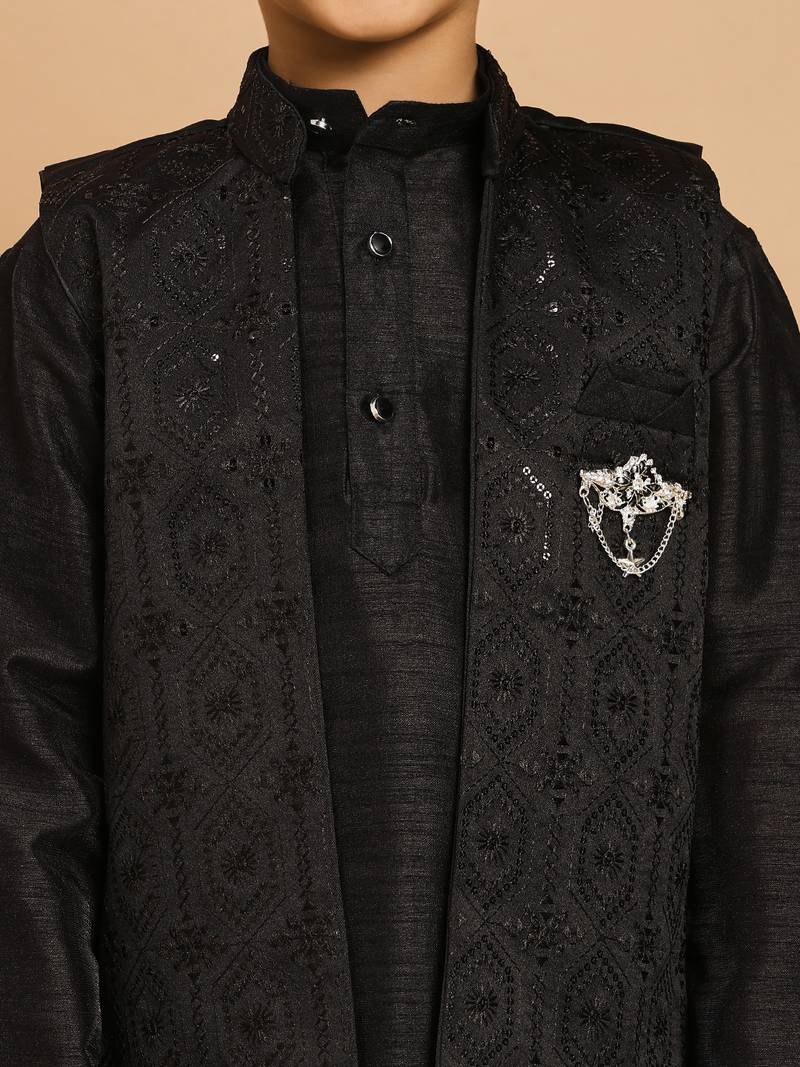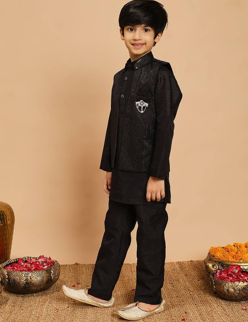 Product Name | Boys Cotton Silk Geometric Sequined Embroidered Kurta & Pyjama Set With Shrug Black | |