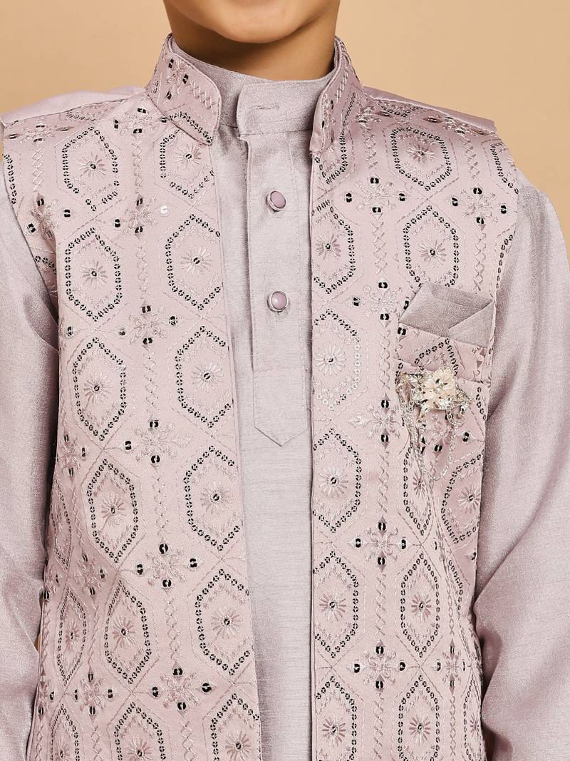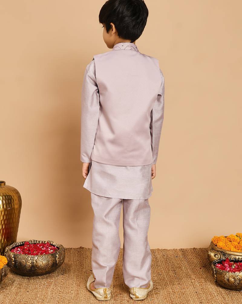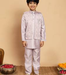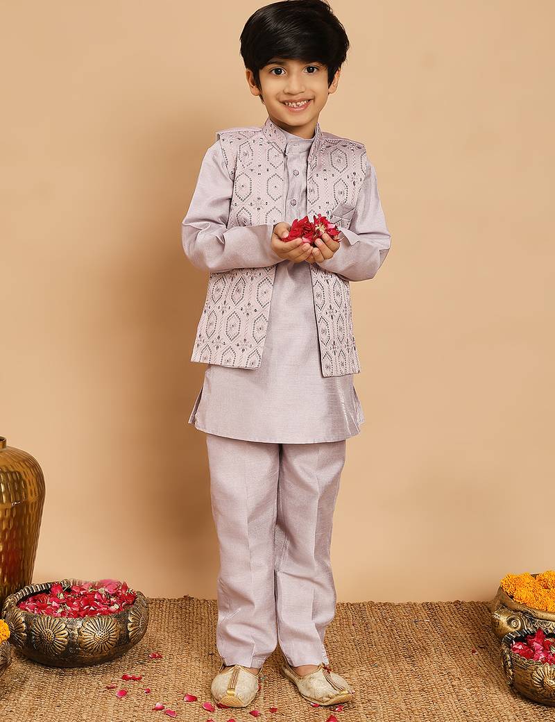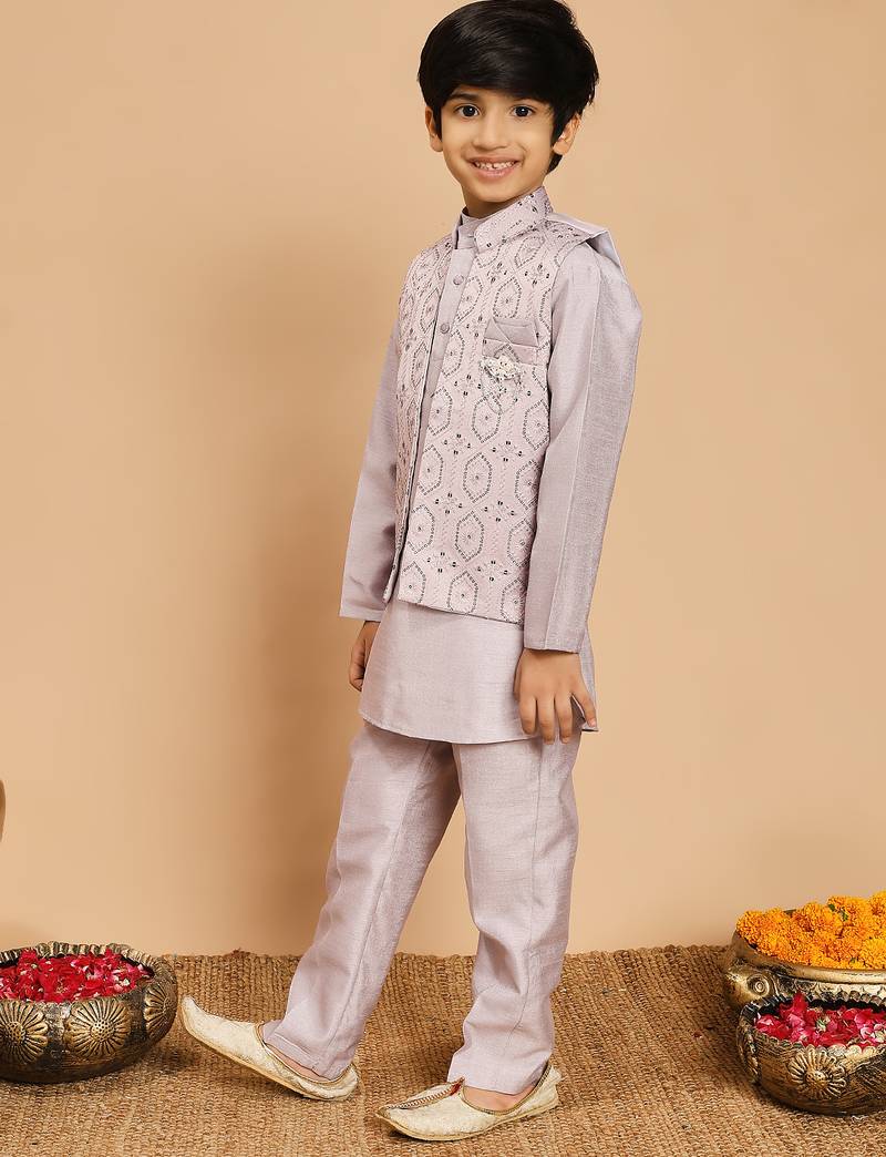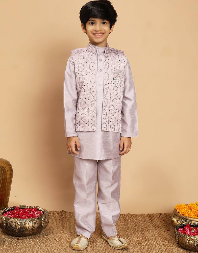 Product Name | Boys Cotton Silk Geometric Sequined Embroidered Kurta & Pyjama Set With Shrug Lavender | |
