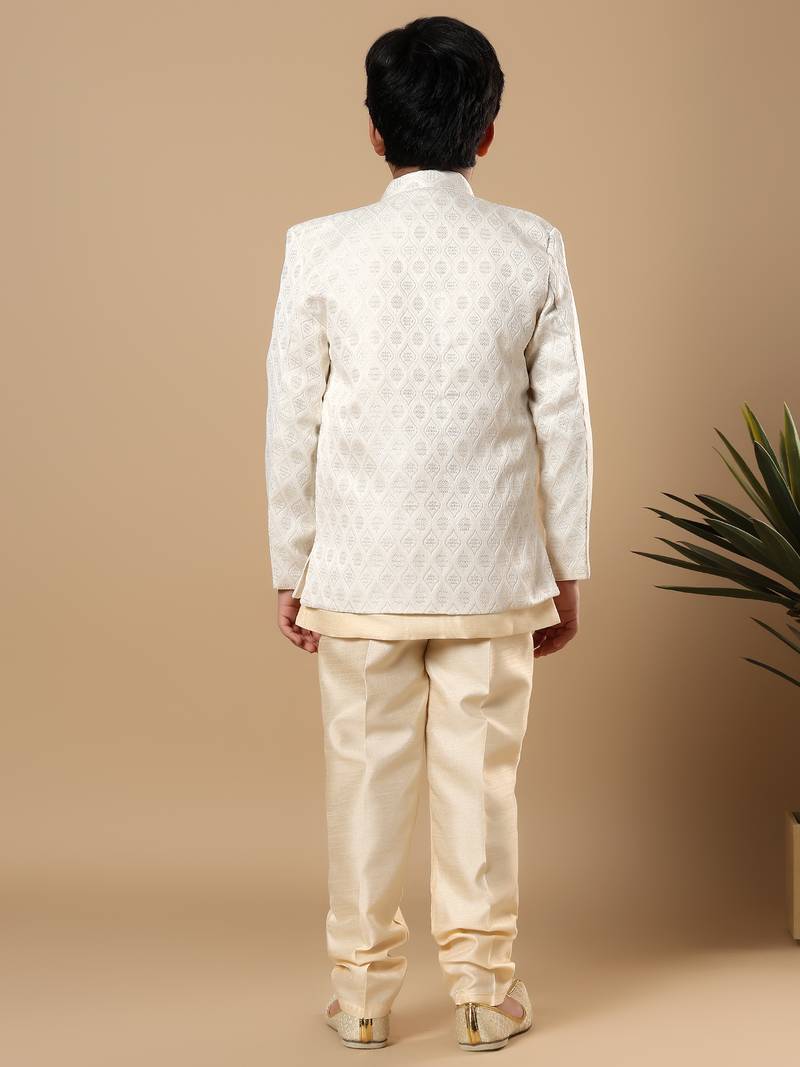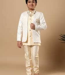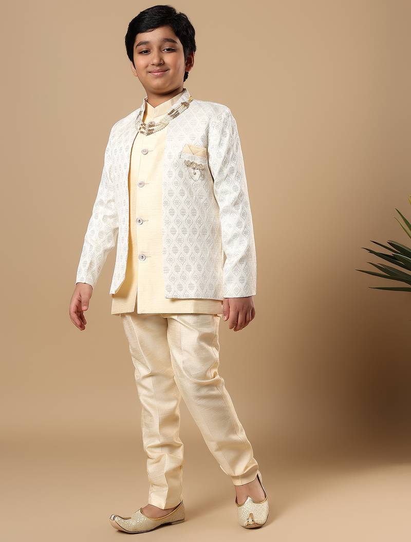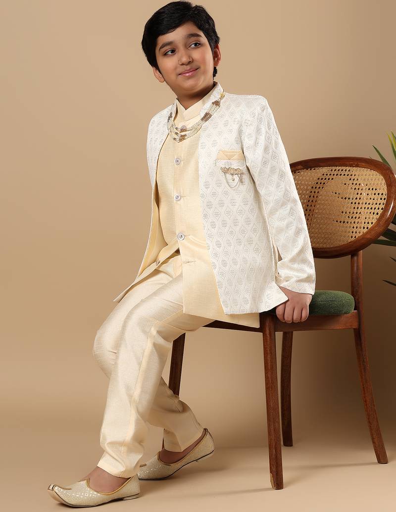 | Product Name | Boys Fawn Cotton Silk Diamond Buti Sequined Sherwani & Trouser Set With Shrug And Necklace | |