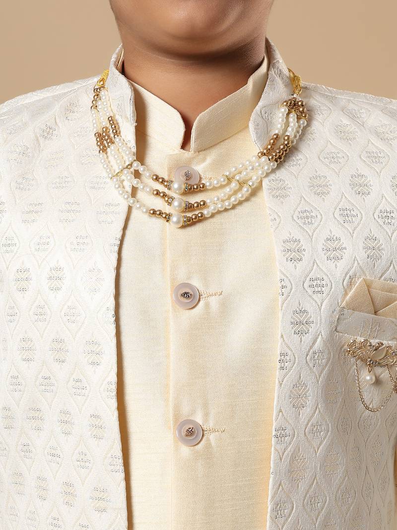 Boys fawn cotton silk diamond buti sequined sherwani & trouser set with shrug and necklace