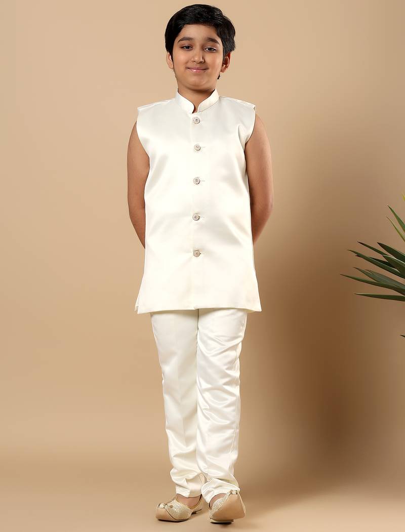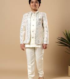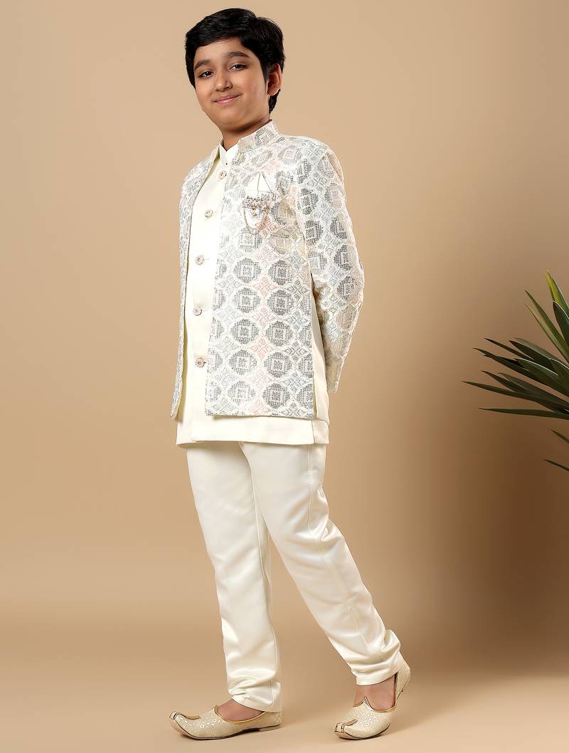 | Product Name | Boys Ivory Satin Geometric Diamond Jaal Embroidered Sequined Sherwani & Trouser Set With Shrug | |