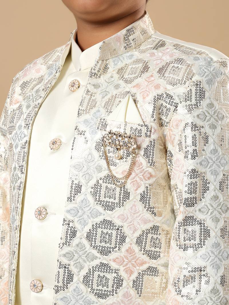 Boys ivory satin geometric diamond jaal embroidered sequined sherwani & trouser set with shrug