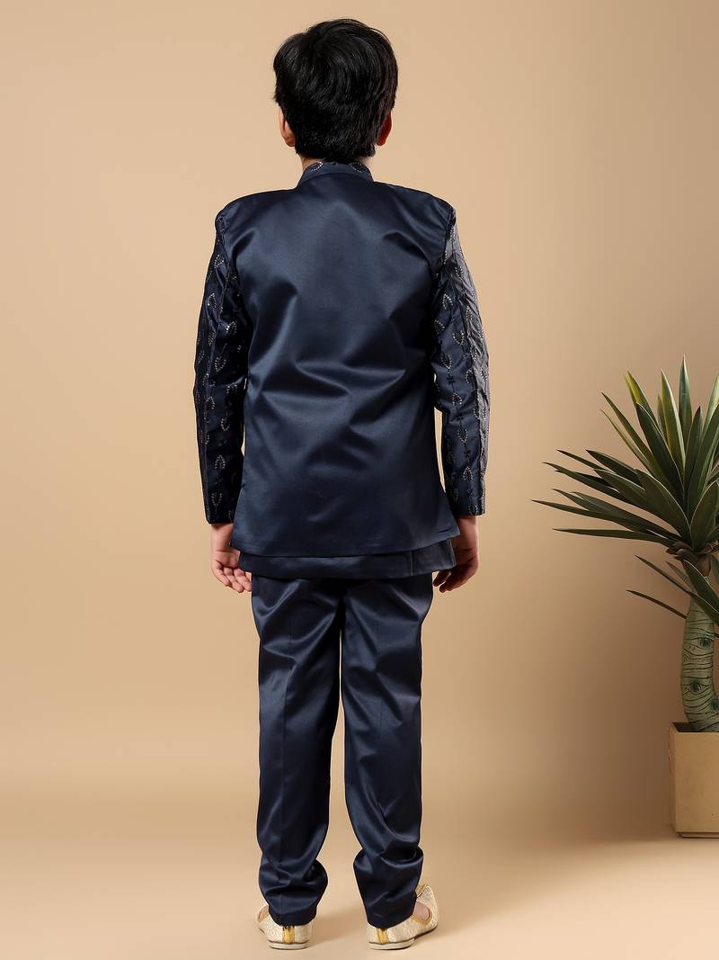 Boys navy blue satin buti embroidered panel work sequined sherwani & trouser set with shrug