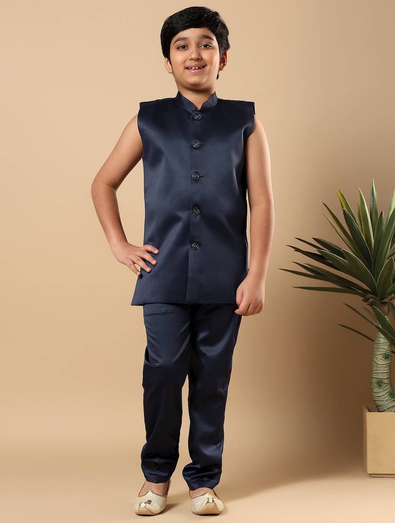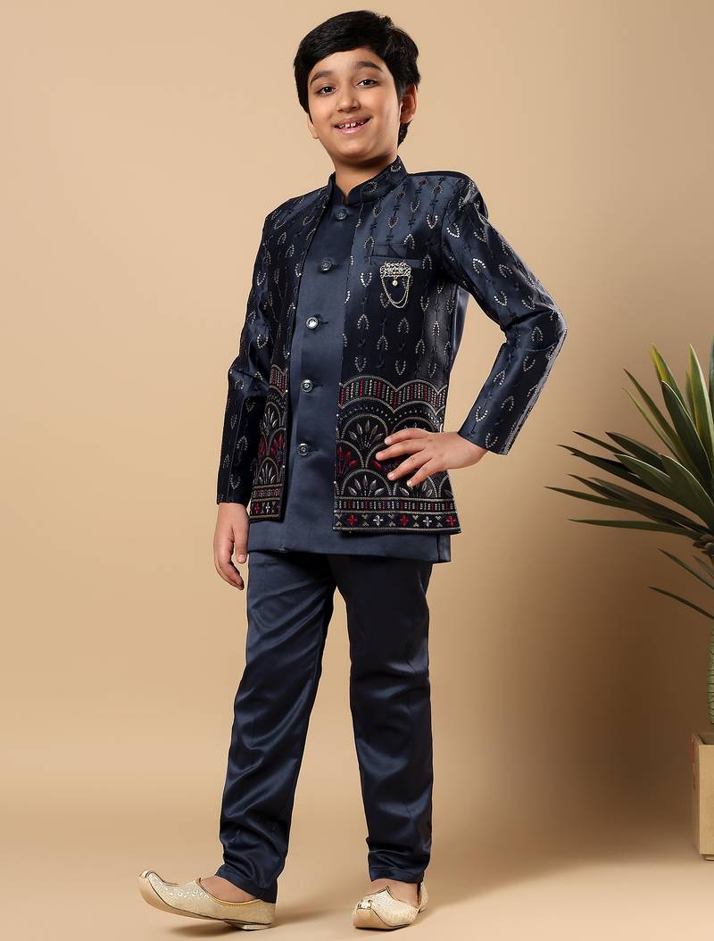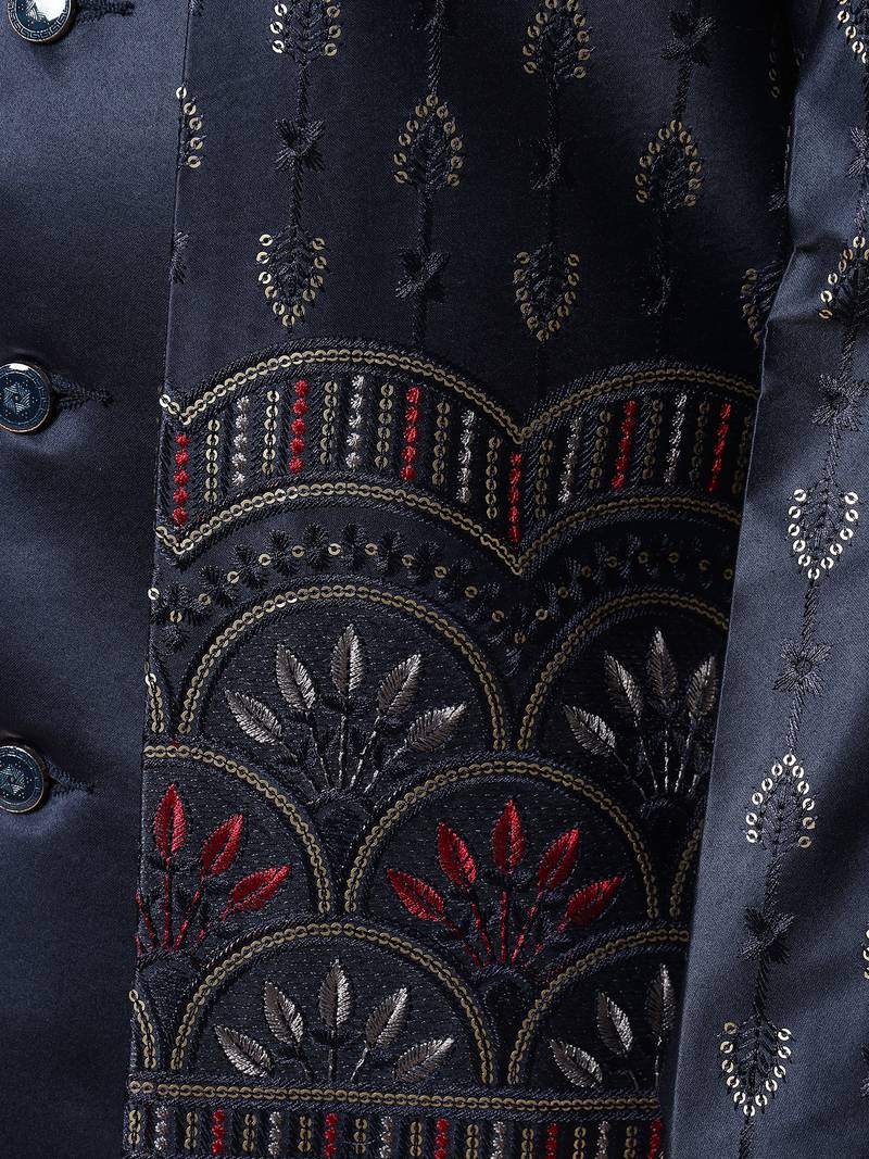 | Product Name | Boys Navy Blue Satin Buti Embroidered Panel Work Sequined Sherwani & Trouser Set With Shrug | |