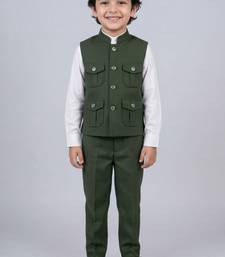 | Product Name | Boys Olive Green Lycra Solid 3 Piece Waistcoat Set With Classic Flap Pockets | |