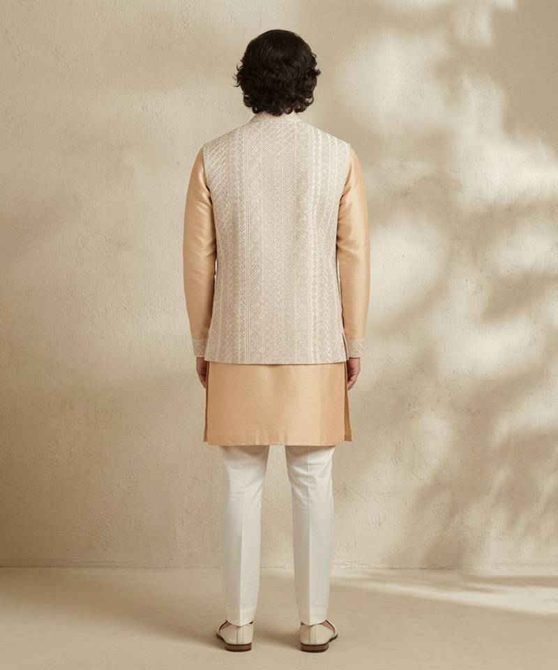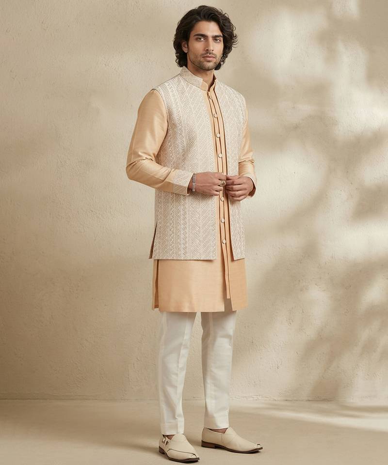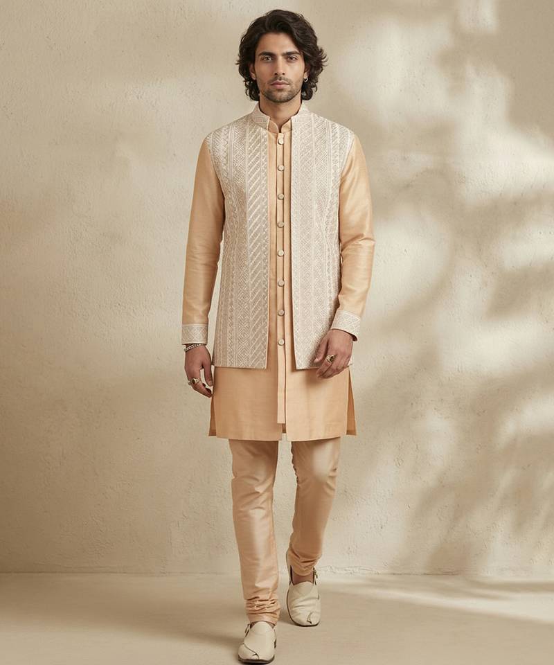 | Product Description | This Beige Embroidered Raw Silk Kurta Set Exudes Timeless Elegance And Refined Craftsmanship. Crafted From Luxurious Raw Silk, The Kurta Features Delicate Embroidery That Enhances Its Regal Charm. Perfect For Weddings, Festive Celebrations, Or Special Occasions, It Pairs Effortlessly With Matching Bottoms, Offering A Sophisticated And Graceful Ensemble.