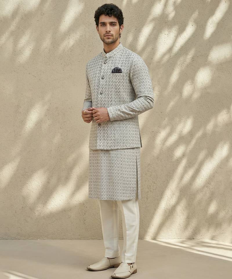 | Product Description | This Ivory Woven Cotton Nehru Jacket Blends Classic Elegance With Everyday Comfort. Made From Soft, Breathable Cotton, It Features A Subtle Woven Texture That Adds Depth And Sophistication. Perfect For Formal Events, Festive Occasions, Or Smart Casual Gatherings, It Pairs Effortlessly With Kurta Sets Or Trousers For A Polished Look.