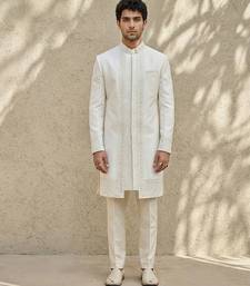 White embroidered raw silk sherwani