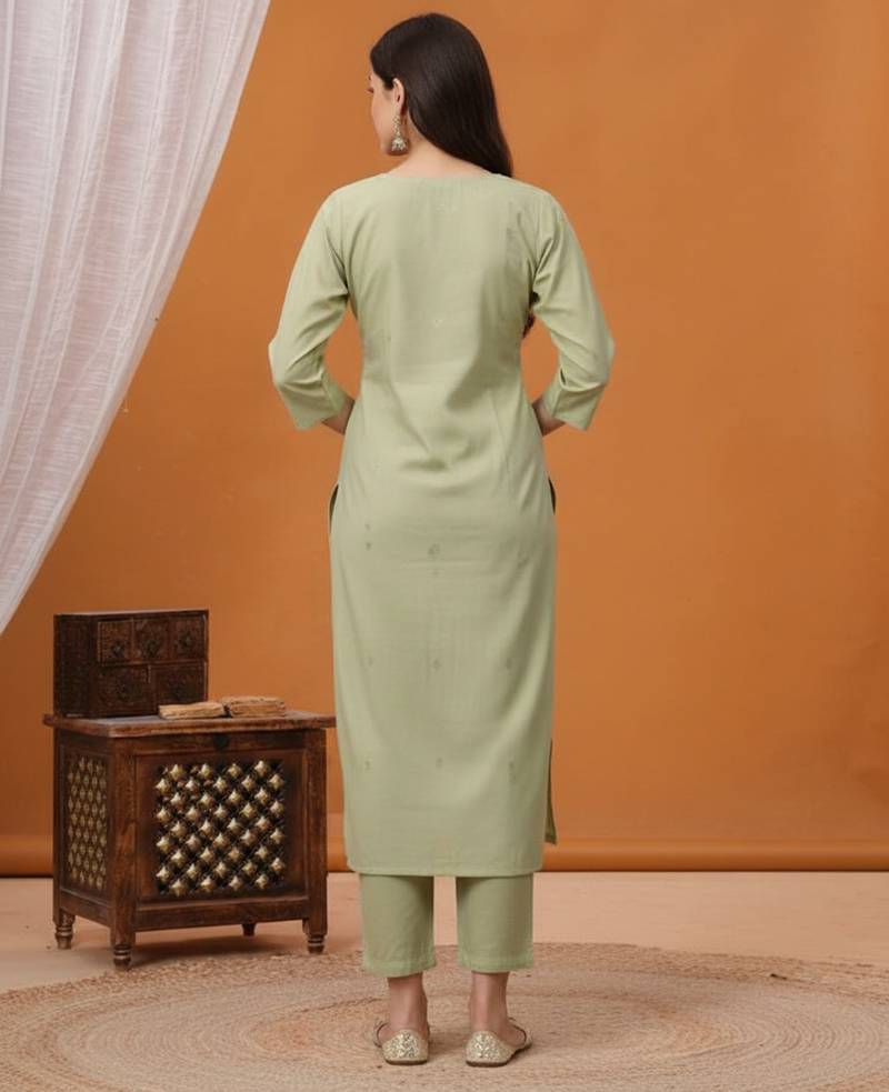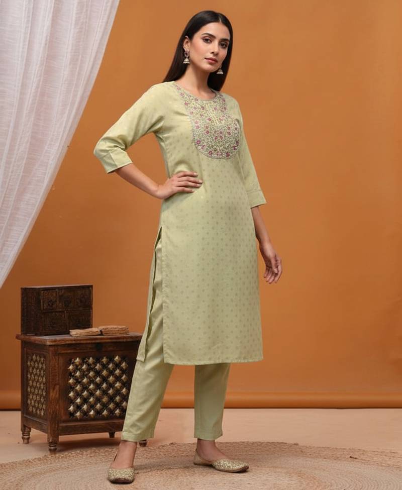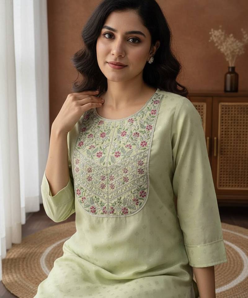 | Product Description | The Women’s Pista Green Embroidered Kurta Pant Set Is A Premium Ethnic Outfit Designed With Elegance And Comfort In Mind. Crafted From Premium Silk Fabric With A Rich, Lustrous Finish, The Kurta Showcases A Heavy Floral Embroidered Yoke That Adds Depth, Texture, And A Classy Aesthetic To The Look. Paired With Comfortable Matching Silk Pants In A Serene Pista Green Shade, This Set Delivers A Refined Festive Appeal Without Being Overly Flashy. Ideal For Functions, Poojas, Family Events, And Work Wear, It’s A Versatile Choice When You Want To Dress Up With Understated Sophistication |