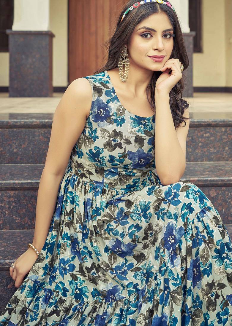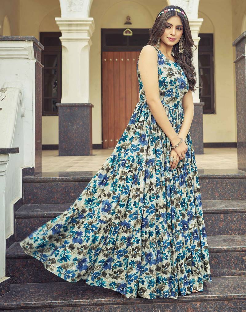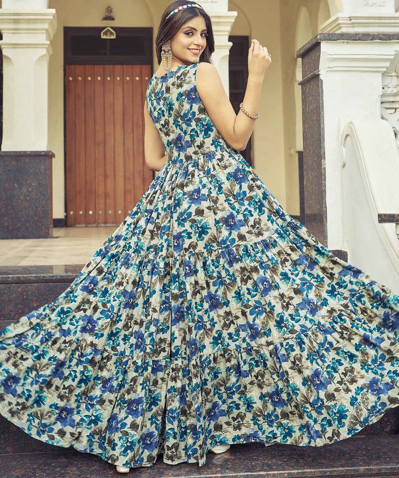 | Product Name | Women Beige Blue Floral Printed Sleeveless Anarkali Maxi Gown | |