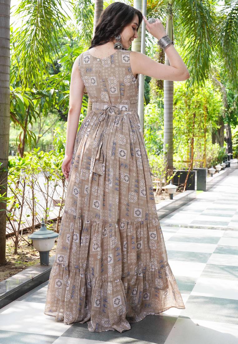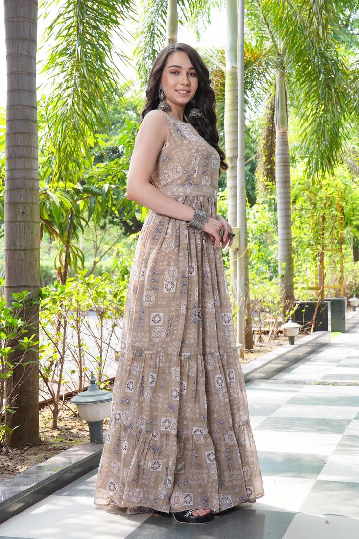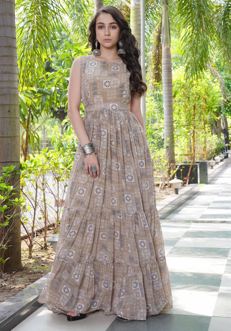 | Product Name | Women Beige Geometric Print Pattern Georgette Fit & Flare Gown | |