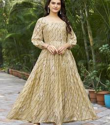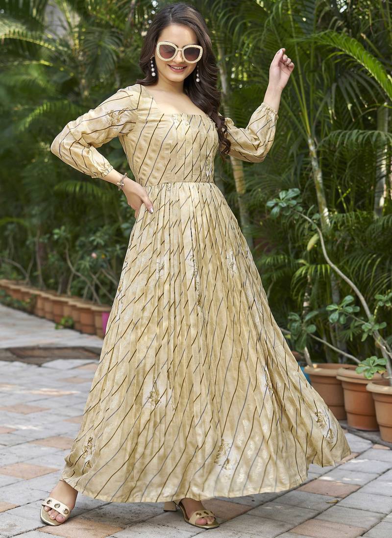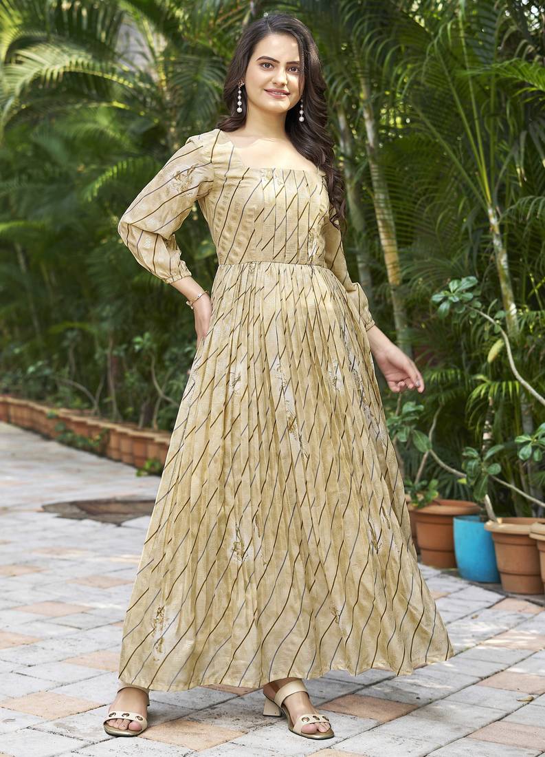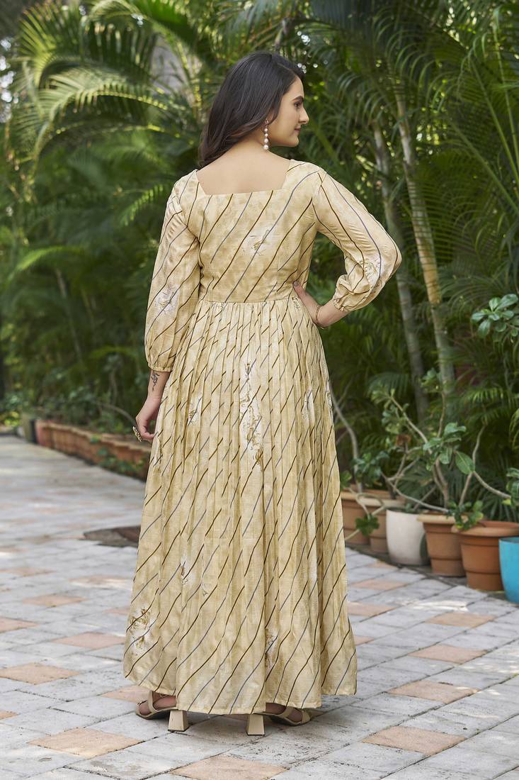 | Product Description | Elevate Your Ethnic Wardrobe With This Elegant Beige And Gold Anarkali Dress, Designed For Effortless Grace And Everyday Sophistication. Crafted In A Soft, Flowy Fabric, The Dress Features A Beautifully Flared Silhouette That Moves Gracefully With Every Step. The Subtle All Over Print Paired With A Structured Square Neckline Adds A Modern Touch, Making It Perfect For Festive Gatherings, Daytime Events, And Casual Celebrations. |