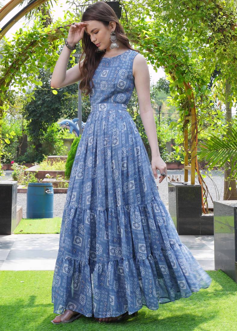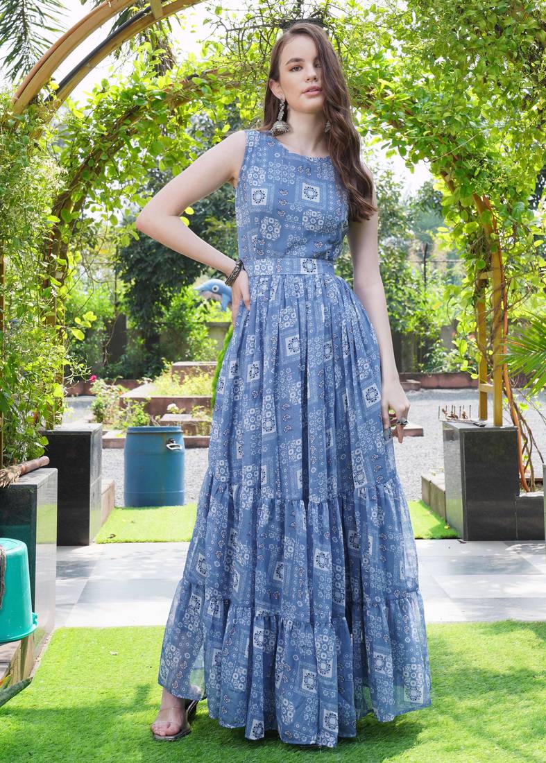| Product Name | Women Blue Geometric Print Pattern Georgette Fit & Flare Gown | |