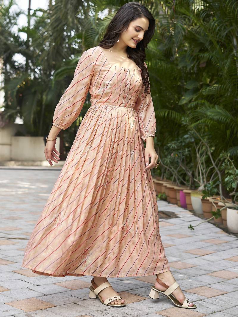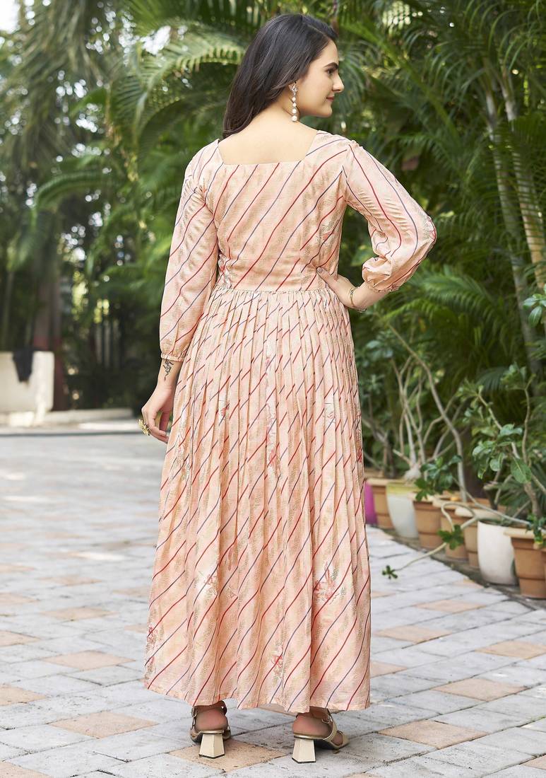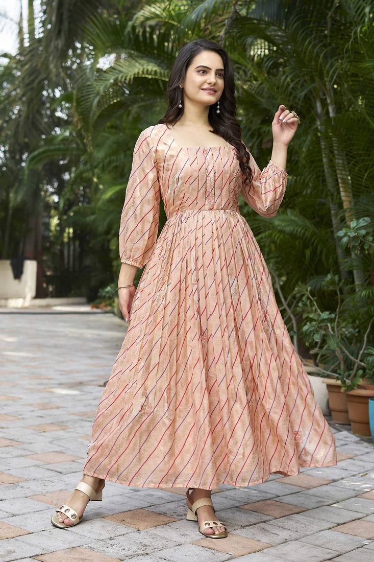 | Product Description | Add Soft Elegance To Your Ethnic Wardrobe With This Peach Printed Flared Maxi Dress. Designed In A Flowy Silhouette, The Dress Features A Structured Square Neckline And A Beautifully Flared Hem That Creates Graceful Movement. The Subtle Diagonal Stripe Print With Delicate Motifs Gives It A Refined Look, Making It Ideal For Festive Gatherings, Daytime Functions, And Casual Celebrations. |