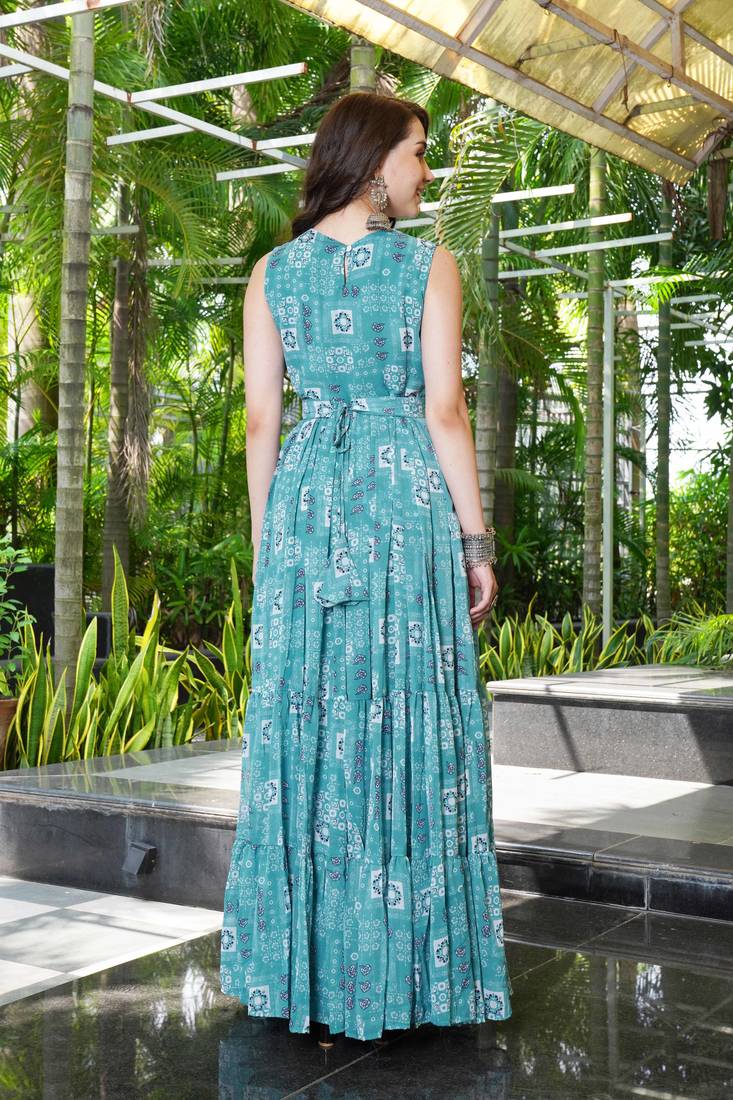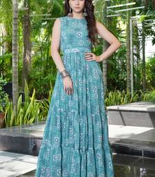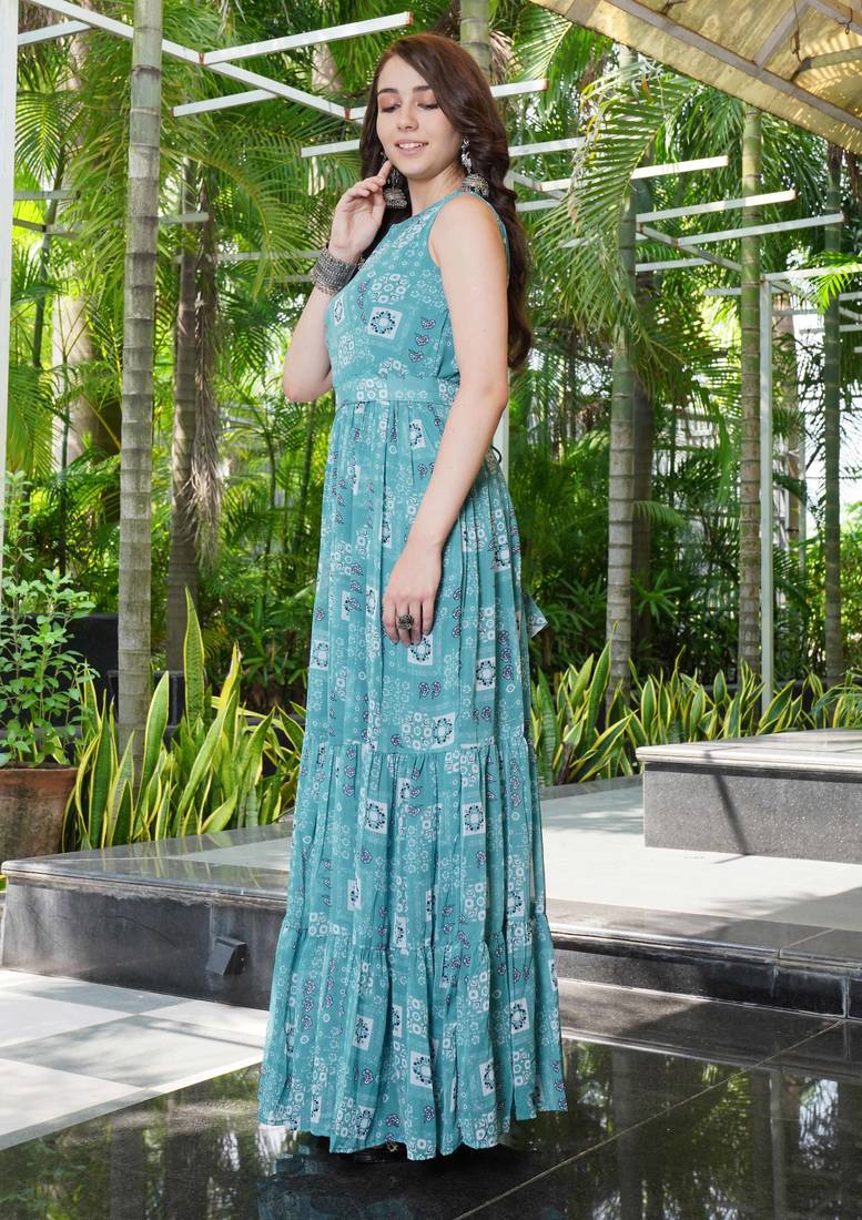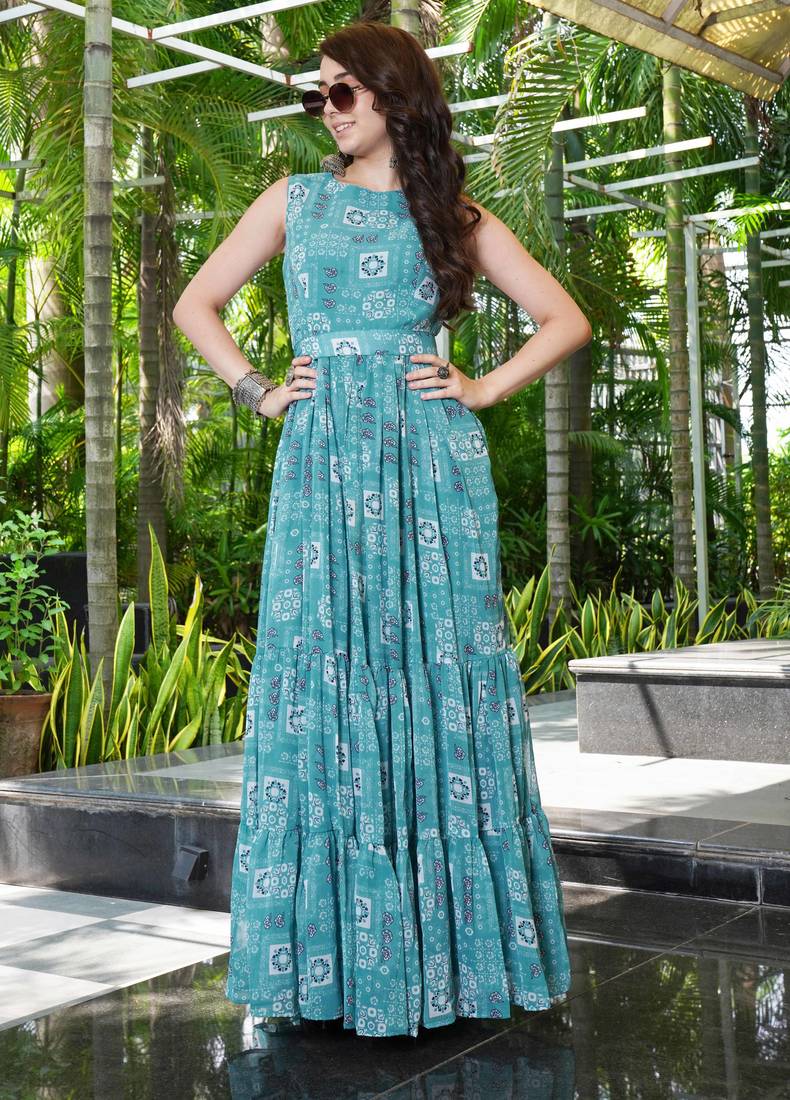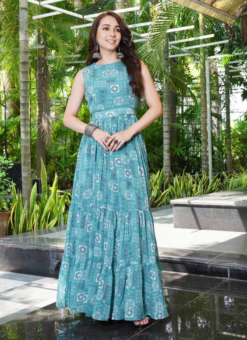 | Product Name | Women Turquoise Blue Geometric Print Pattern Georgette Fit & Flare Gown | |