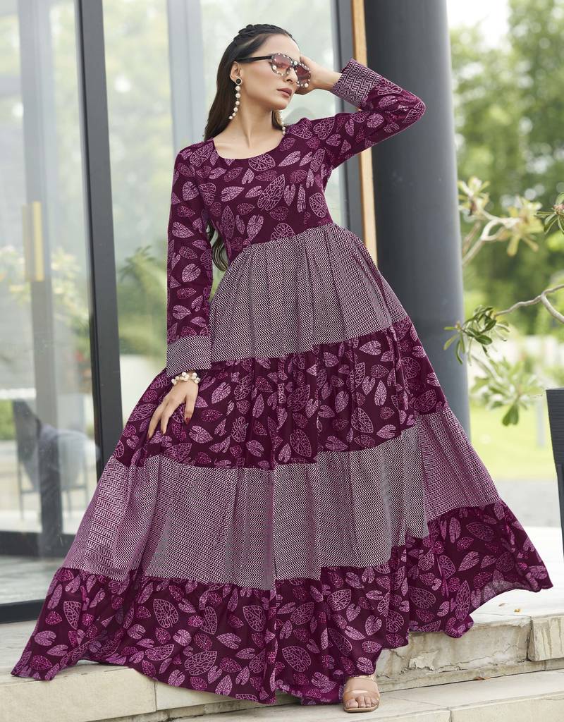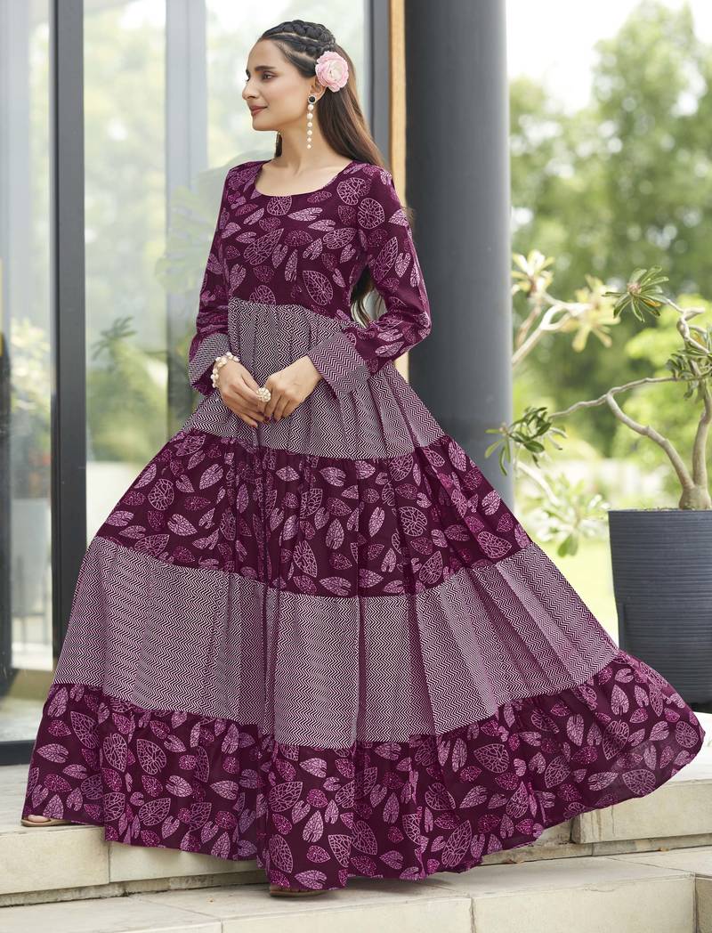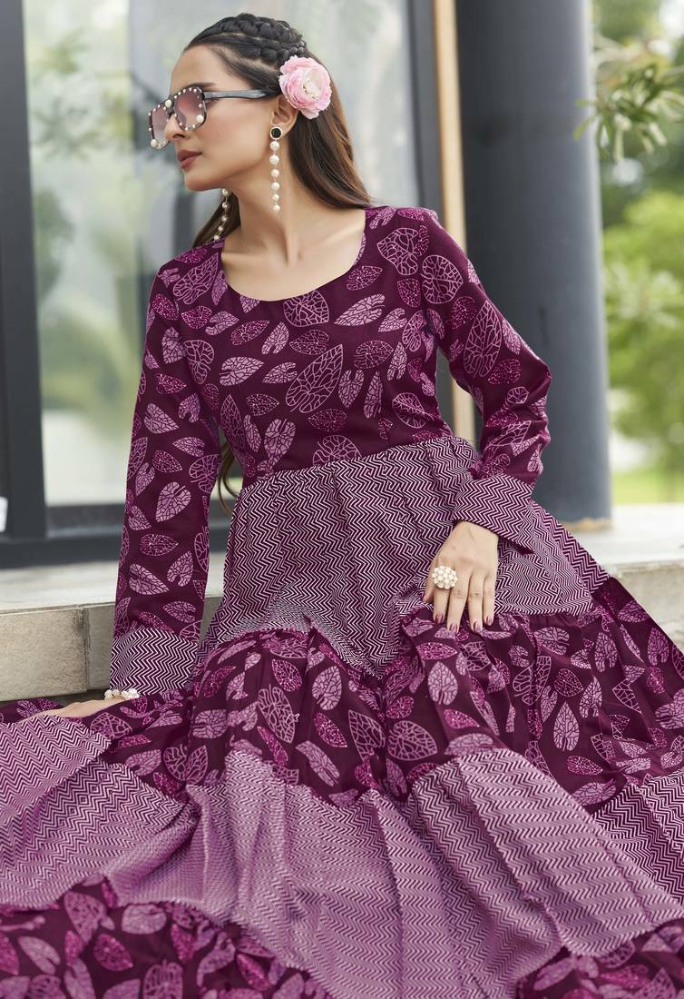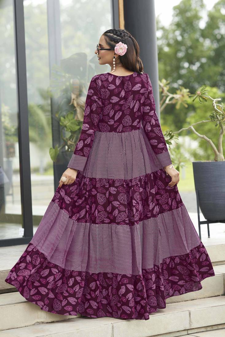 | Product Name | Women Wine Maroon Leaf Printed Tiered Anarkali Maxi Dress | |