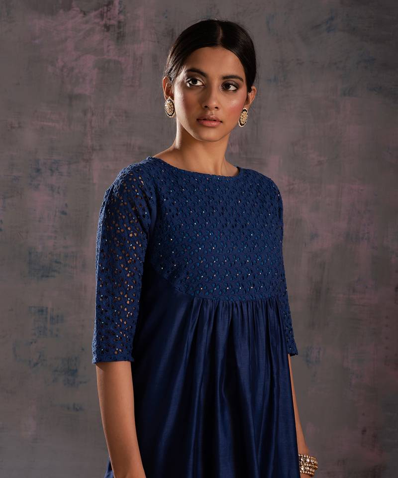 | Product Description | Chanderi Midnight Blue Kurta With Cutwork On Yoke & Sleeve Studded With Swarovski. This Round Yoke Kurta Is Paired With Straight Cutwork Pants Studded With Swarovski And Organza Dupatta Embellished With Swarovski.