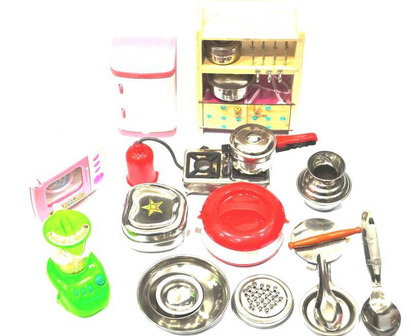 One Big Set Of Stainless Steel Toy Kitchen Utensils, Wooden Stand And Appliances. A True Collectible & Suitable For Kids Above 5 Year